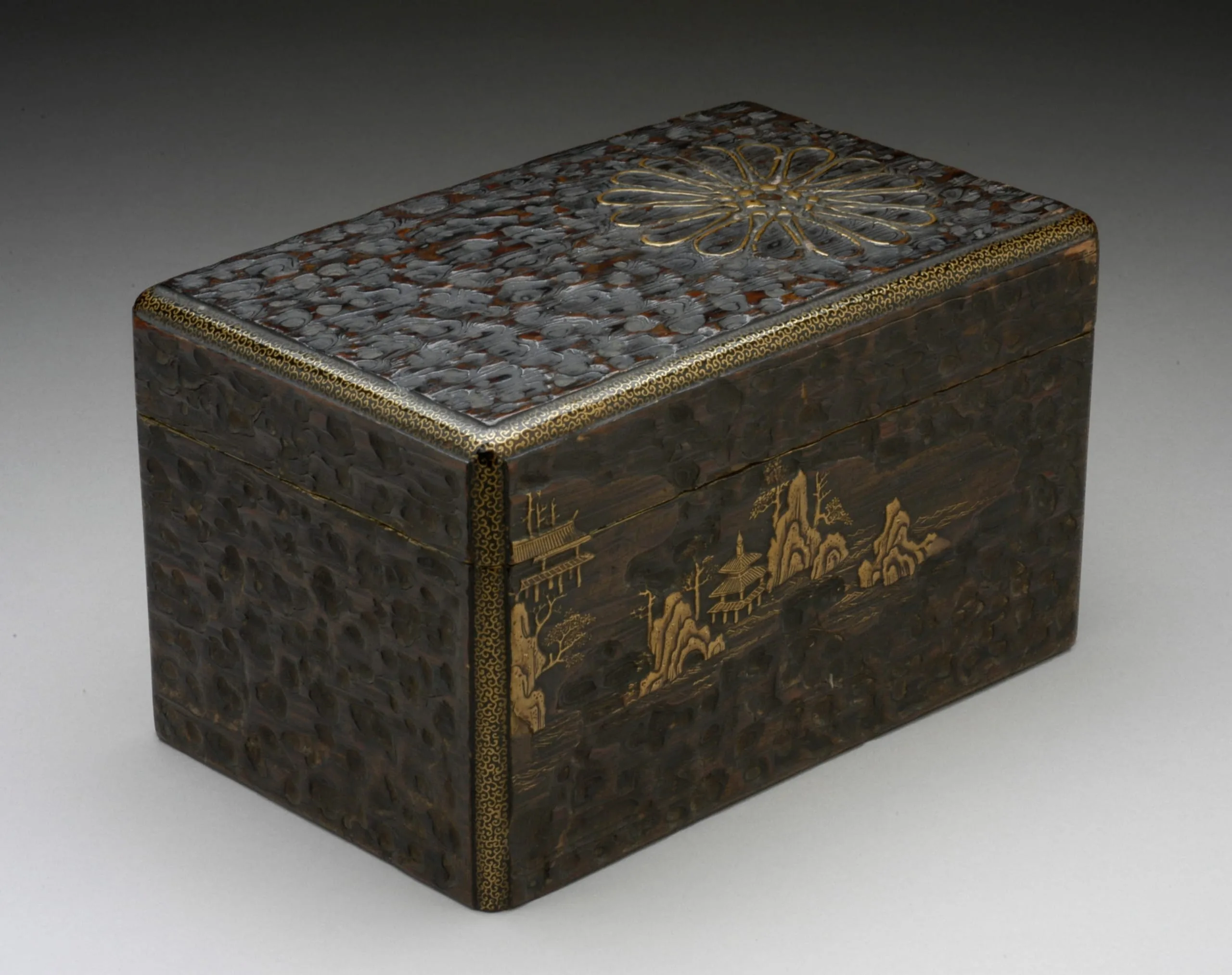- Brown lacquer over carved wood; gold maki-e, inlaid gold metal