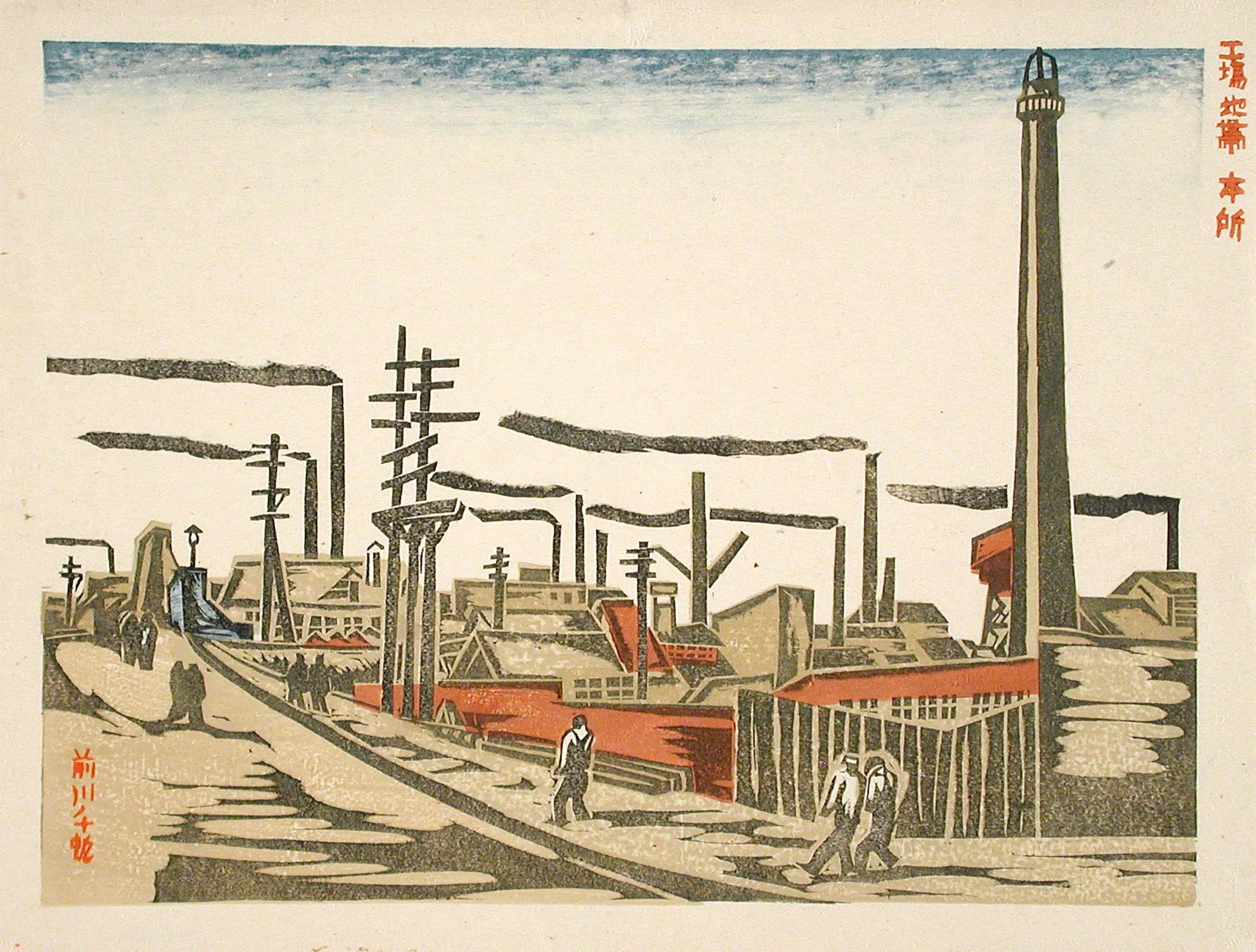 Woodblock print of an industrial harbor scene with smokestacks, utility poles, workers on a road, and bold flat areas of black, red, and tan