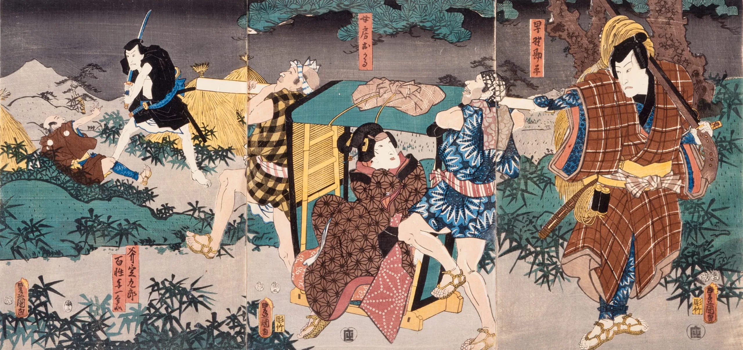 - Act V of series The Storehouse of Loyal Retainers, a Primer, with the characters Hayano Kanpei (Shigenji), his wife Okaru, Onosada Kurō and Farmer Yoichibei
