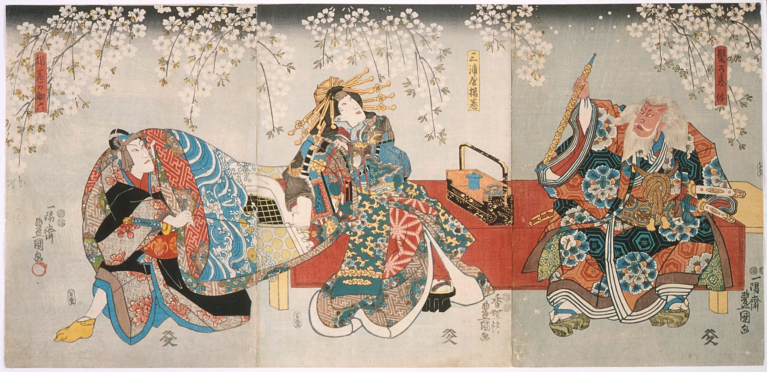 - Ichikawa Kodanji IV as Hige no Ikyū, Bandō Shūka I as Miuraya Agemaki, and Ichikawa Danjūrō VIII as Agemaki no Sukeroku in the play Sukeroku kuruwa no hanamidoki