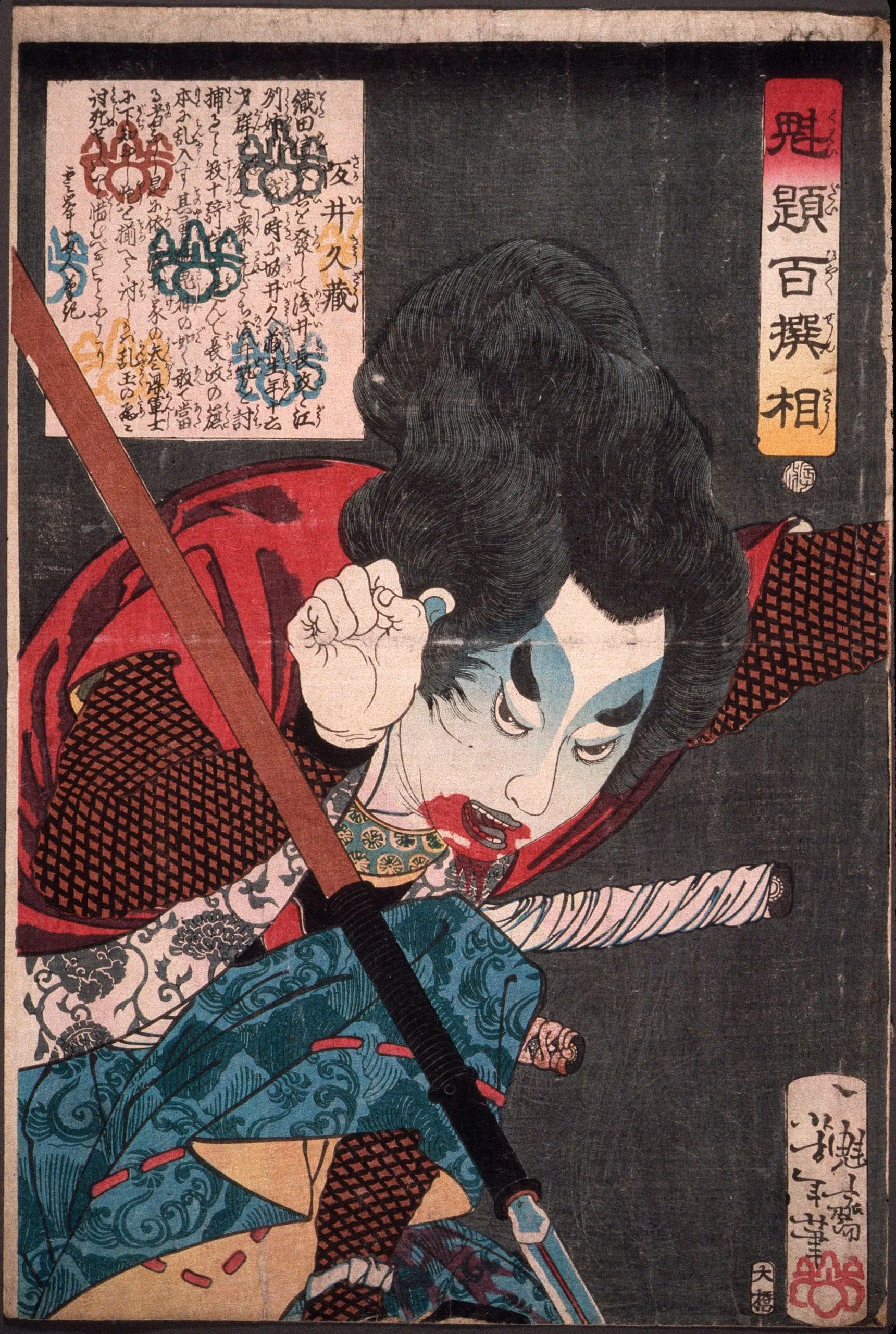 Here, Yoshitoshi shows the fierceness of the boy warrior Sakai Kyūzō, a retainer for the first great unifier of Japan after the Warring states era, Oda Nobunaga (1534-1582) in the mid-16th century. Sakai's blue-shaded eyes and bloody mouth illustrate his youthful, violent rage that would propel him toward an honorable death early in his life. Sakai, the son of samurai Sakai Masahisa, engaged in his first battle at the young age of 13 and was killed two years later, in 1568, while defending his master, Nobunaga, in his march to Kyoto. Such an example of indefatigable loyalty would have made Sakai a compelling subject to Yoshitoshi's audience.