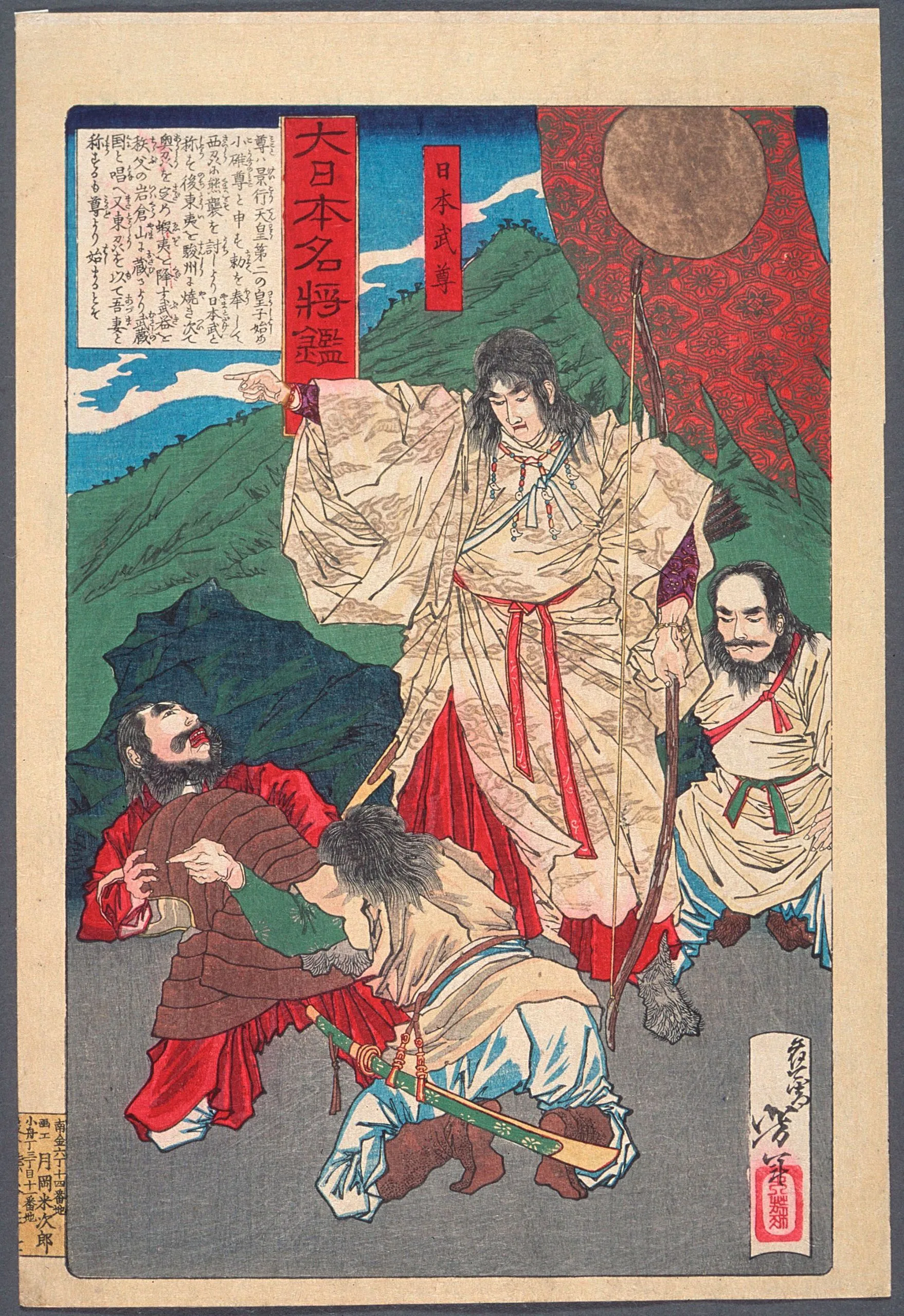 Yamato Takeru was a legendary Japanese prince and the first example of the Japanese "loser-hero" archetype, defined loosely as a man of great strength and bravery who dies tragically after achieving a noble goal. This archetype is a mainstay in Japanese lore, and was especially popular during Yoshitoshi's time. Exhibiting wily determination, Yamato Takeru disguises himself here in women's clothing to infiltrate an enemy encampment. Smitten by Yamato's feminine beauty, two enemy chieftains invite him to sit with them at a dinner. Yamato obliges, subsequently revealing his identity and assassinating them both, slashing them to pieces "like a ripe melon." After subduing the rebels, Yamato begins his long journey home, during which a malevolent deity causes Yamato to fall ill, resulting in his lonely, inglorious death in the inhospitable wilderness. This tragic end has made Yamamoto a poignant character and a quintessential "loser-hero".