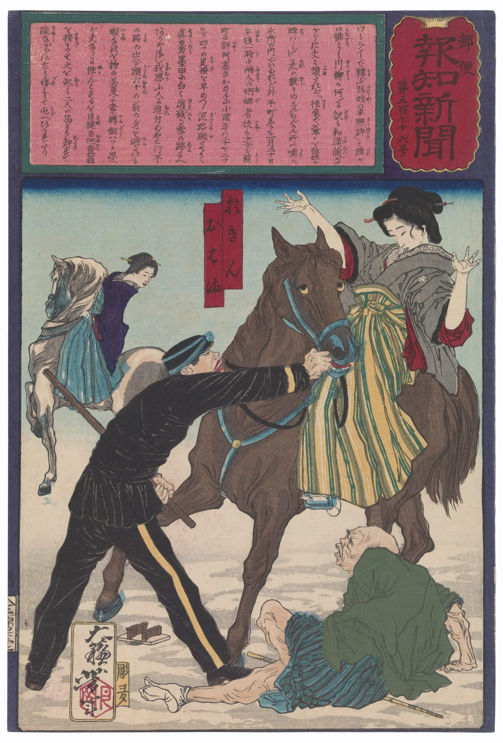 - Police Arresting the Geisha Oharu and Okin for Injuring an Old Man While Galloping on Horseback