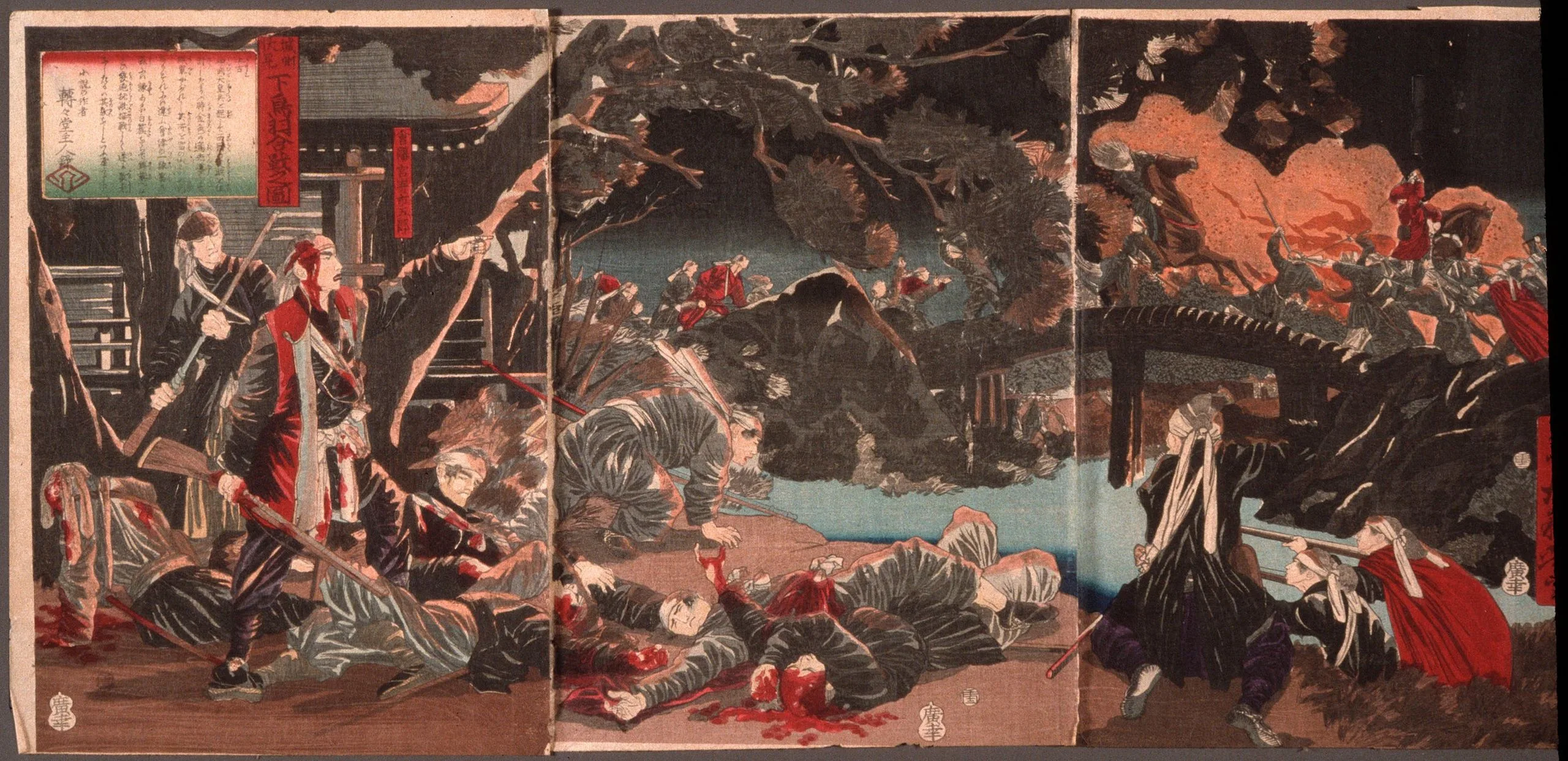 In this triptych, we see the rout of the samurai by the imperial troops at the Battle of Lower Toba at Fushimi in 1868. At far right, rifle-bearing imperial soldiers crouch next to dead and dying comrades, taking aim at samurai fleeing across a river. Rifles offered the imperial troops a distinct advantage, yet as evidenced by the numerous mangled bodies of the soldiers, the traditional swords and pikes of the samurai inflicted great damage on their ranks. A blood-soaked figure to the left stands upright and appears to command the battle, with his left hand gesturing toward the direction of the fleeing samurai. Yoshitoshi's direct witnessing of the Battle of Ueno led him to translate into print the horrors of war and bravery of the soldiers who faced it. His intent to portray these gruesome realities is evident in this and many more prints of his early career.