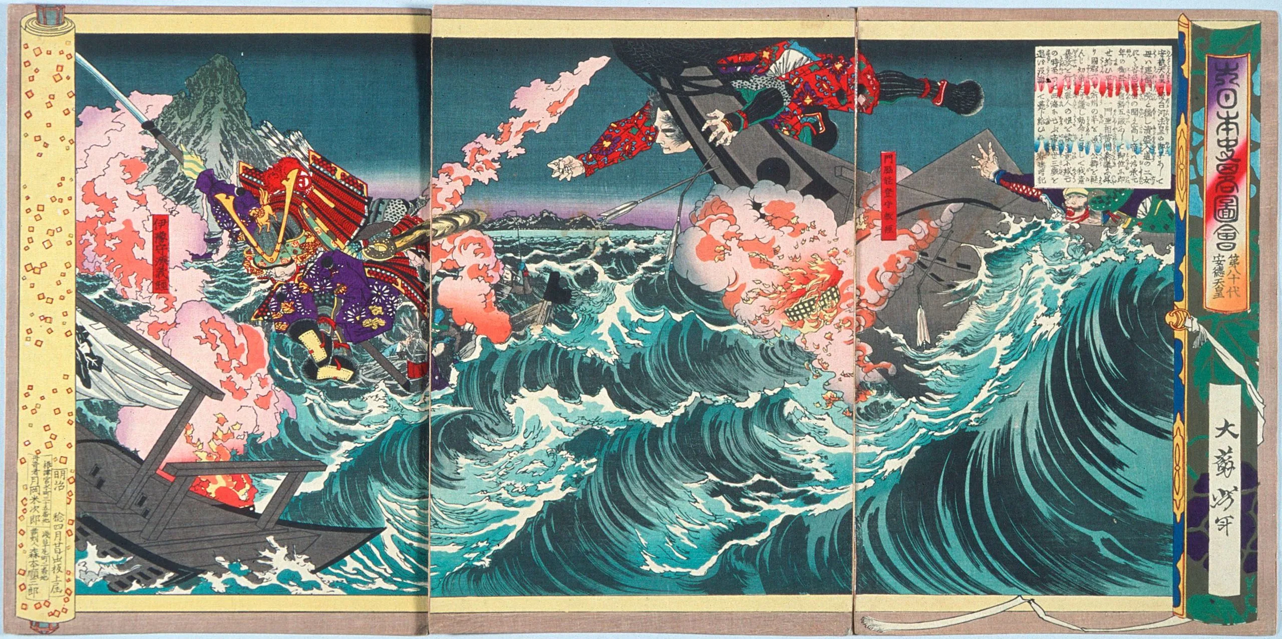 The great battles in 1185 at Yashima and Dannoura, two port cities located along the strait between Honshū and Kyushū, constituted the turning point in the Minamoto and Taira (Genpei) War (1180-1185) and in the life of Minamoto no Yoshitsune, (1159-1189) the heroic leader of the offensive against the Taira navy. Three of these prints depict a point in the Battle of Dannoura in which Yoshitsune leaps from boat to boat to escape the commander of the Taira navy, Noritsune. This is the first and only time Yoshitsune ever retreated from a foe, according to the Tales of Heike. His retreat foreshadows the remainder of Yoshitsune's life. Yoshitsune's successes at Yashima and Dannoura would arouse the envy and suspicion of his elder brother Yoritomo (1147-1199), who calls for the capture and execution of Yoshitsune. Yoshitsune spends the remainder of his life in hiding and ultimately commits seppuku, surrounded by Yoritomo's soldiers. He is a prime example of the "loser-hero" archetype immortalized in Japanese literature, theatre, and legend.