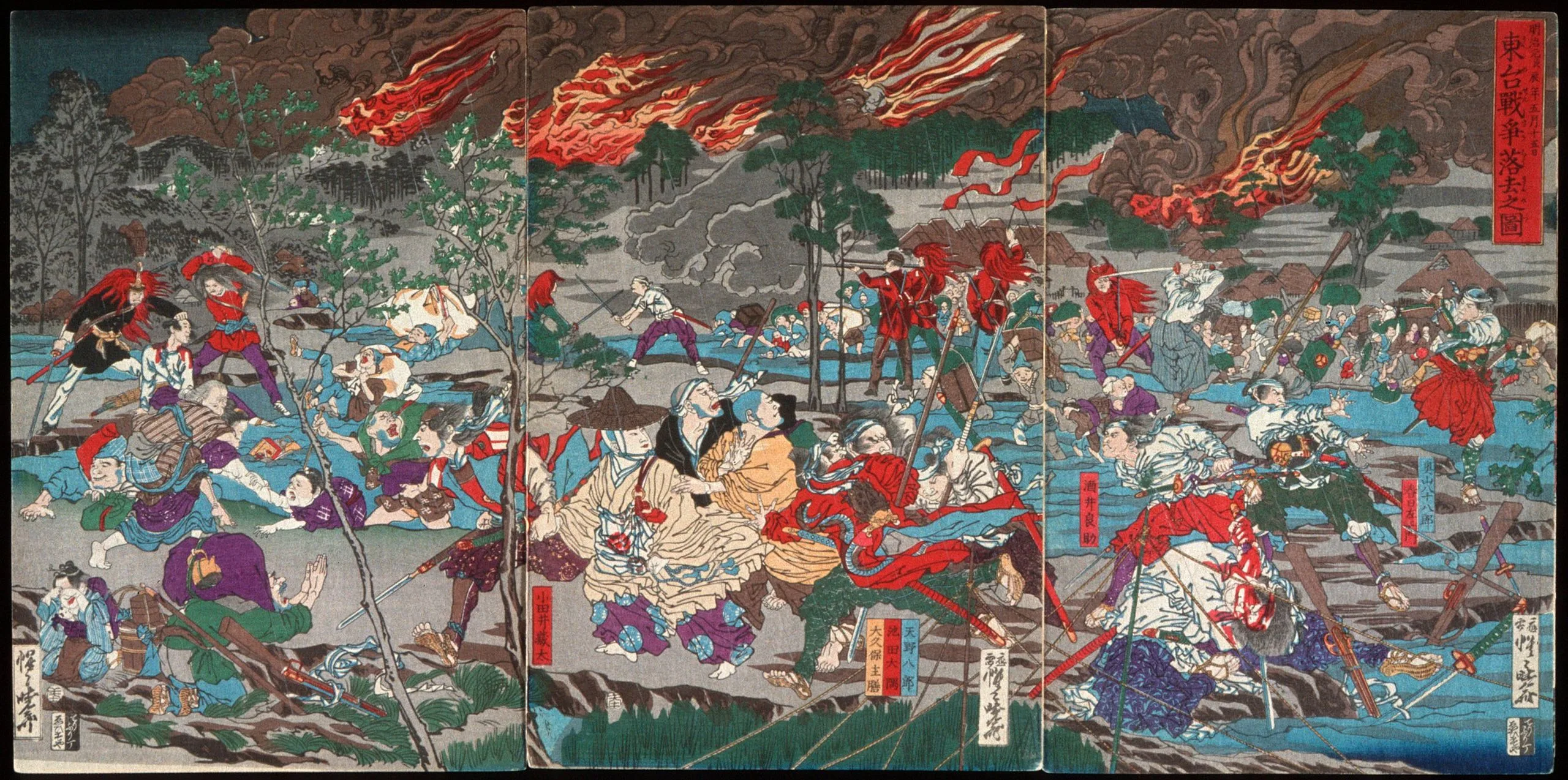 Although not as graphically violent as Yoshitoshi's prints of the same subject, Kawanabe Kyōsai's "Battle of Ueno" captures the chaos of battle with similar energy and flair. Action-filled backgrounds upstaged by frenzied soldiers in the foreground lend a sense of confusion and complexity to the battlefield; figures run in all directions, and spent arrows and swords are stuck into the earth at every angle, frustrating any sense of directionality or order. In the center, samurai loyalists run frantically in disarray. One of them, Amano Hachirō, (1831-1868) died during the battle while helping his comrades escape; some of the others, including the general Ikeda Ōsumi, would later commit ritual suicide (seppuku). By placing these tragic figures in a scene of absolute tumult, Kyōsai has crafted a poignant image of a rapidly changing Japan.