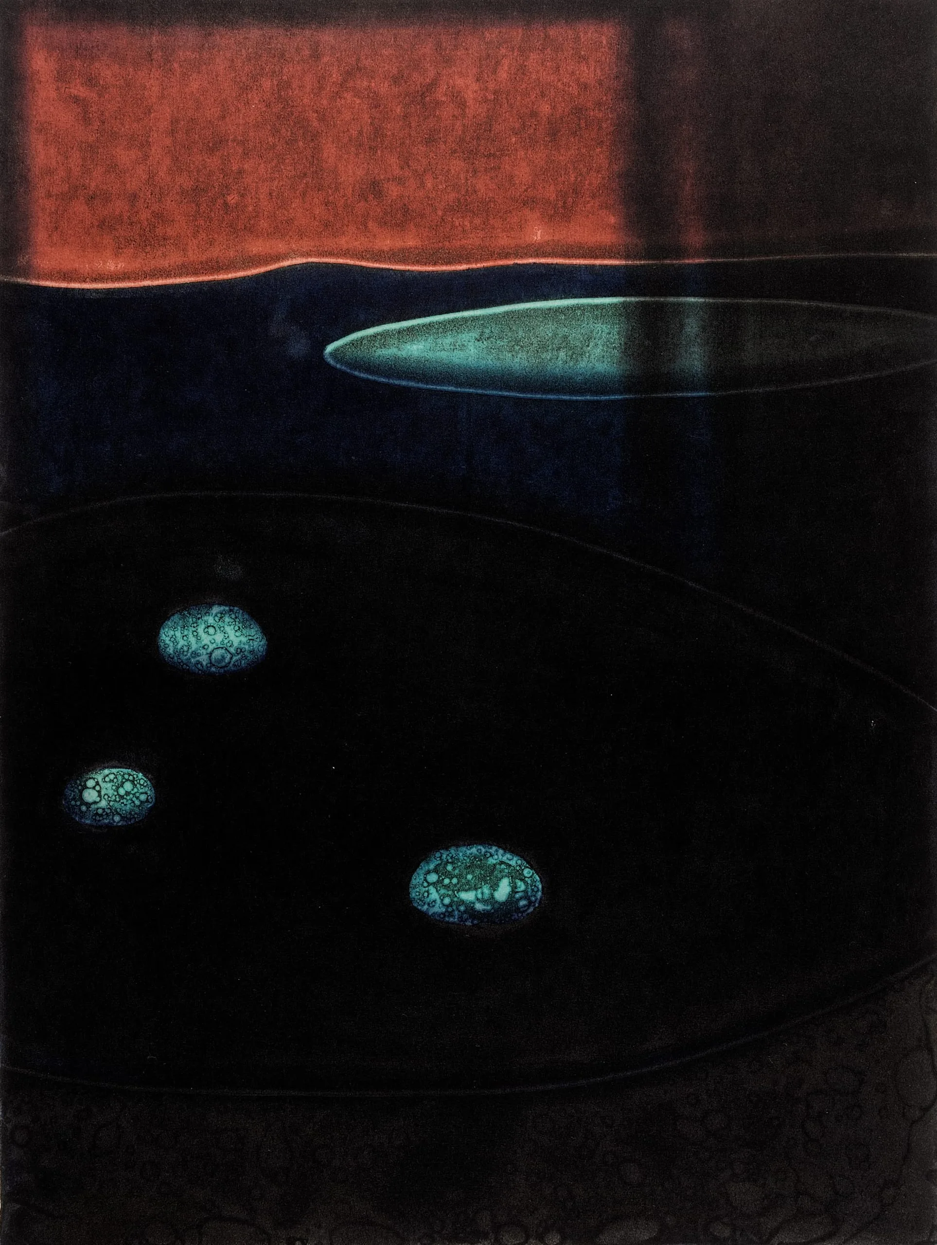 - Woodblock print; oil and water base colors, shellac, torn paper, and dyes