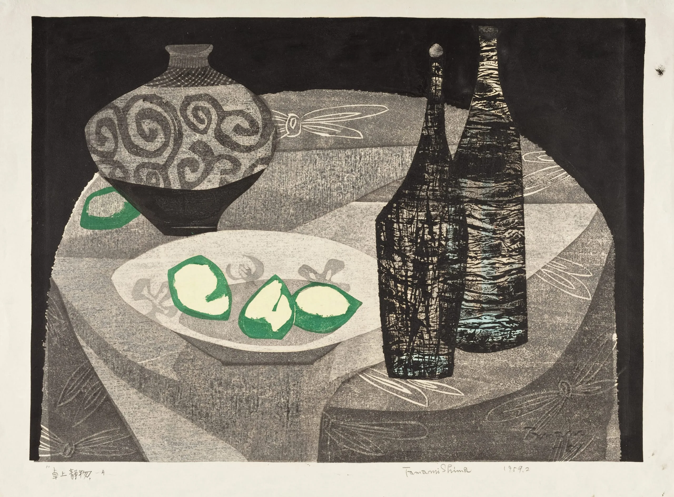 Woodblock print still life in gray, black, and green showing a decorated round vessel, a dish of sliced citrus, and two tall bottles on a draped table