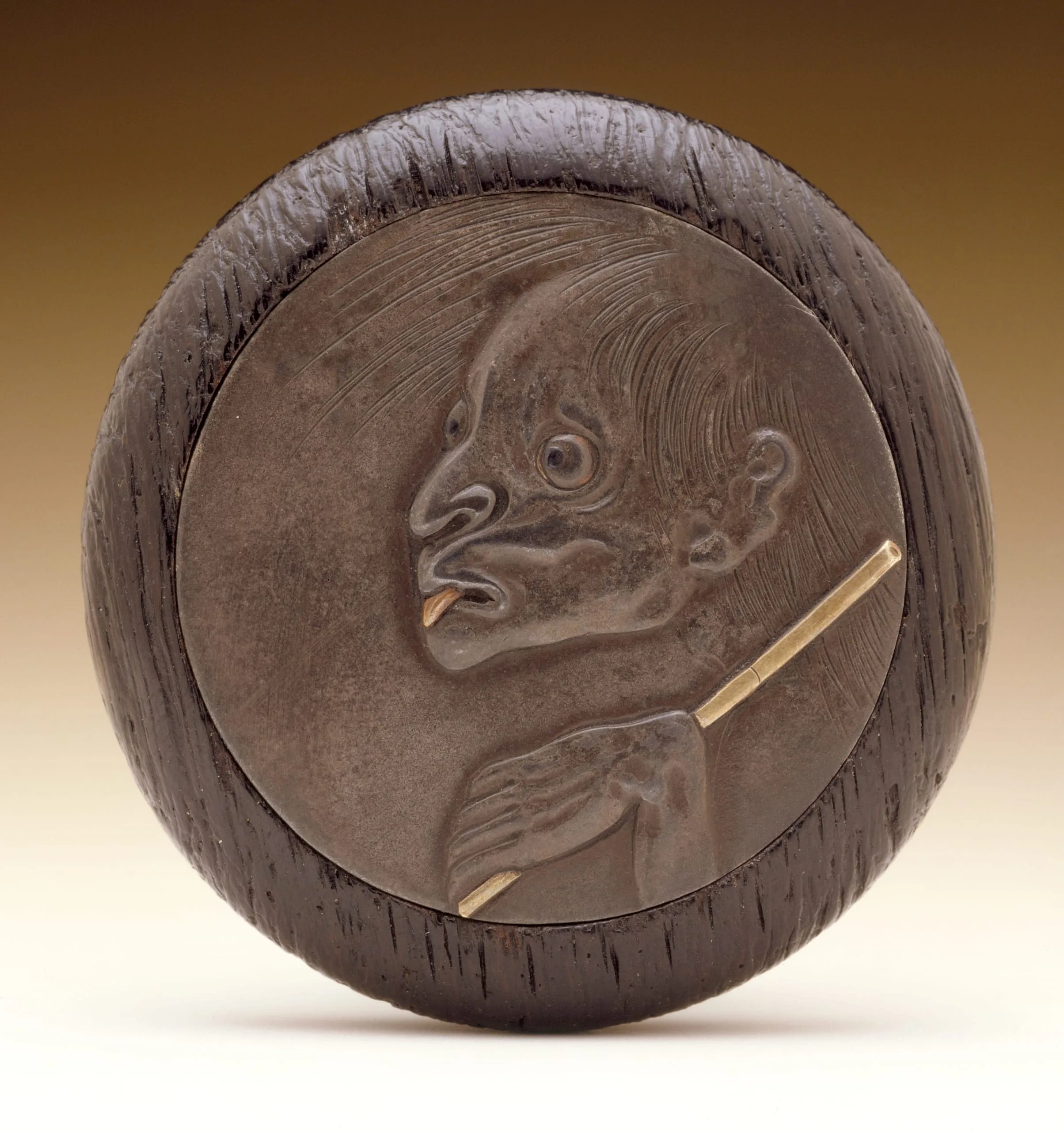 - Silvered bronze, mixed-metal disk, ironwood bowl; kagamibuta type