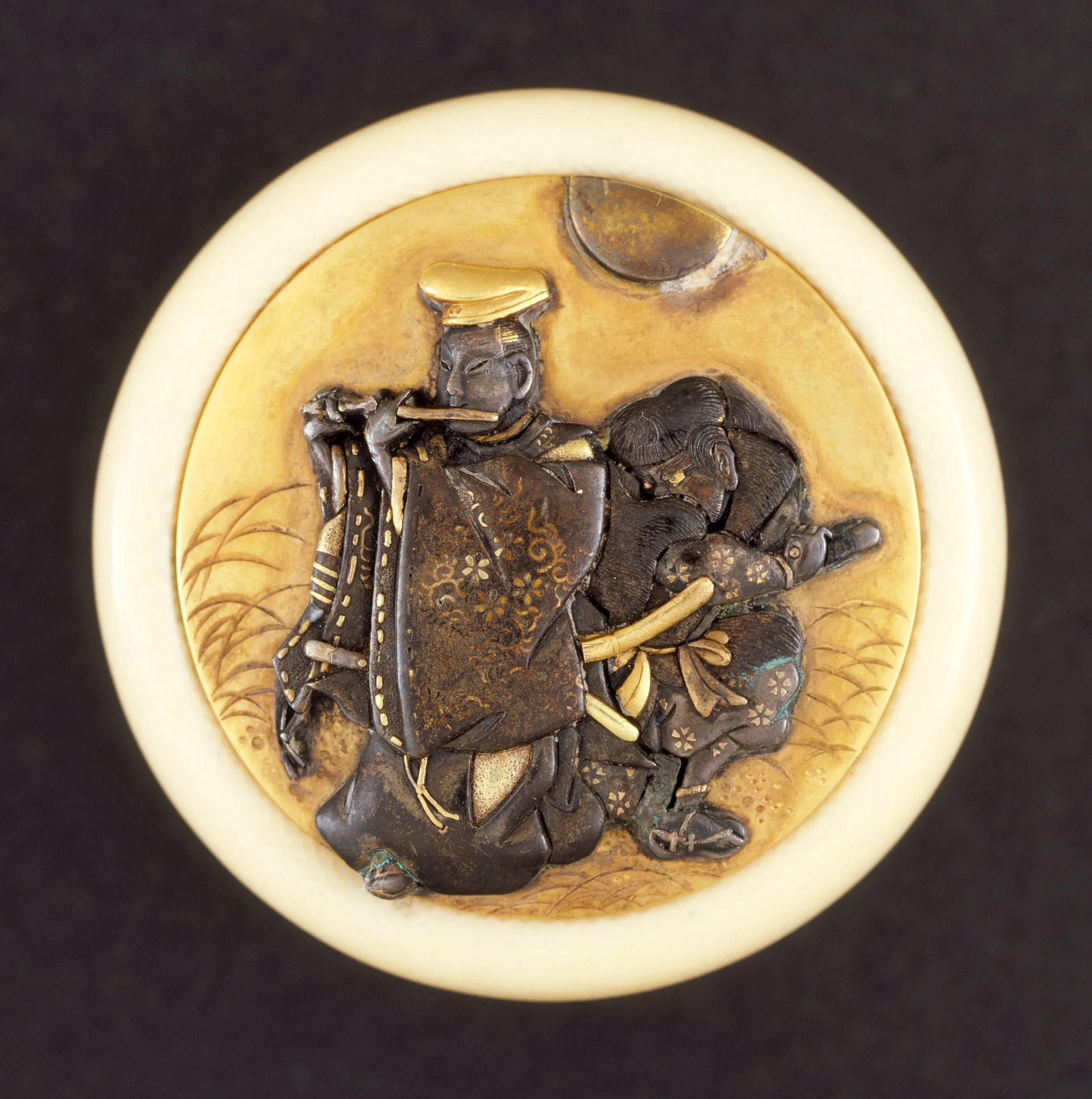 - Gold, mixed-metal disk, ivory bowl; kagamibuta type