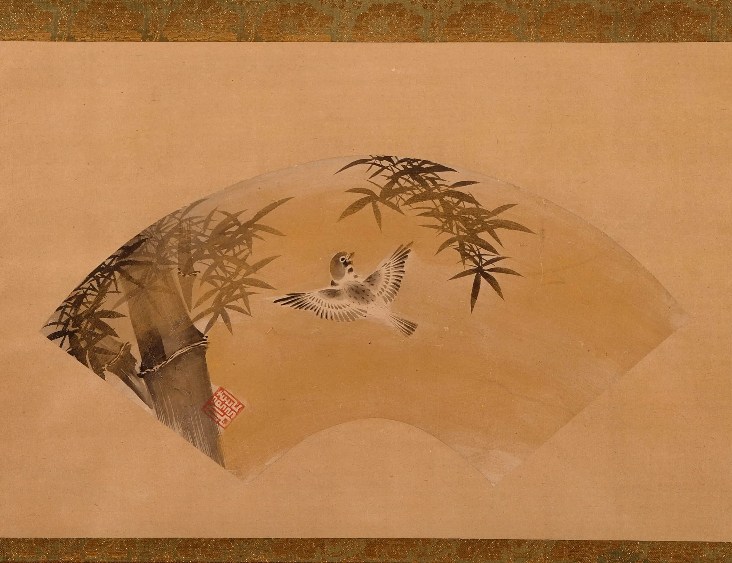 - Fan mounted as hanging scroll; ink on paper with gold wash