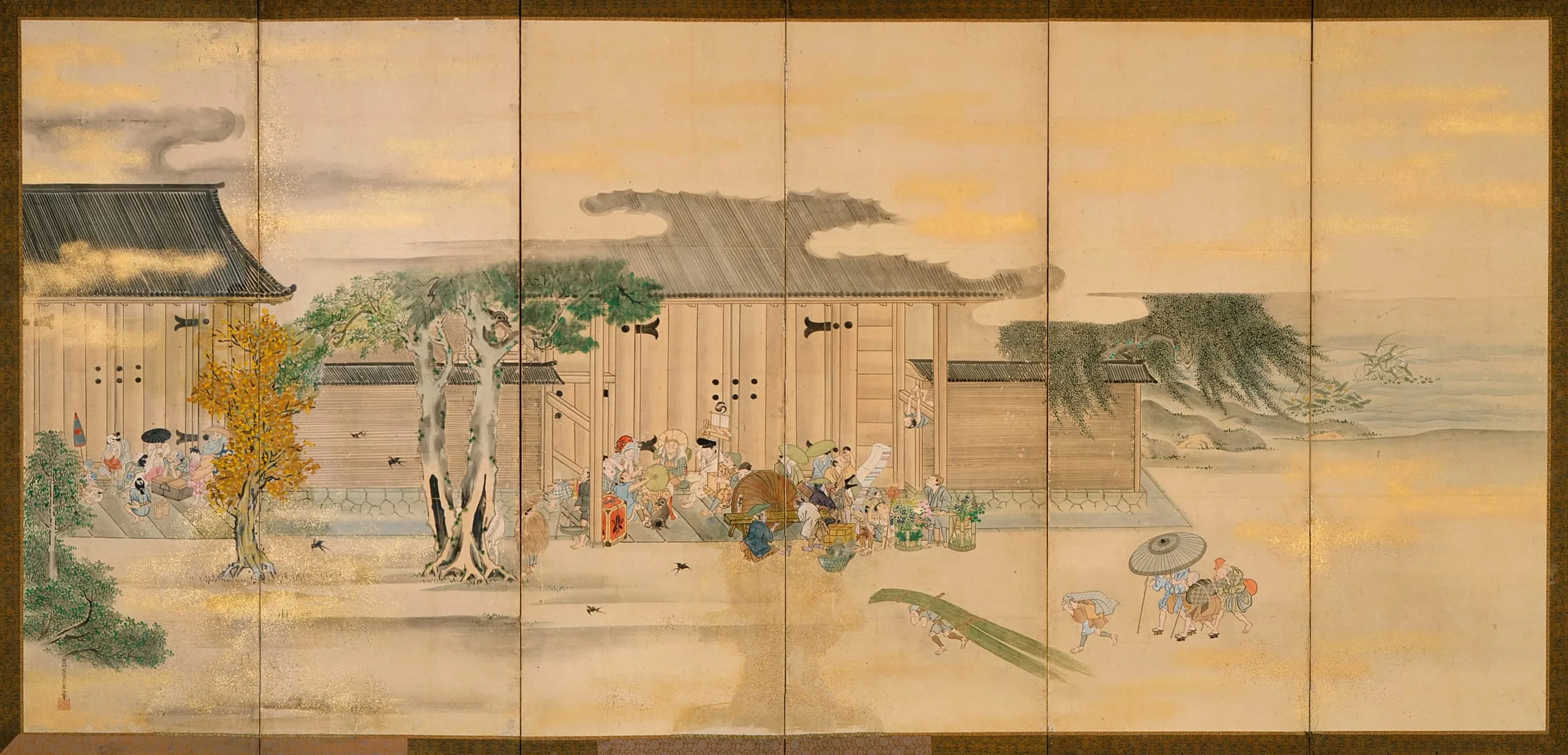 - Pair of six-panel screens; ink and color on paper