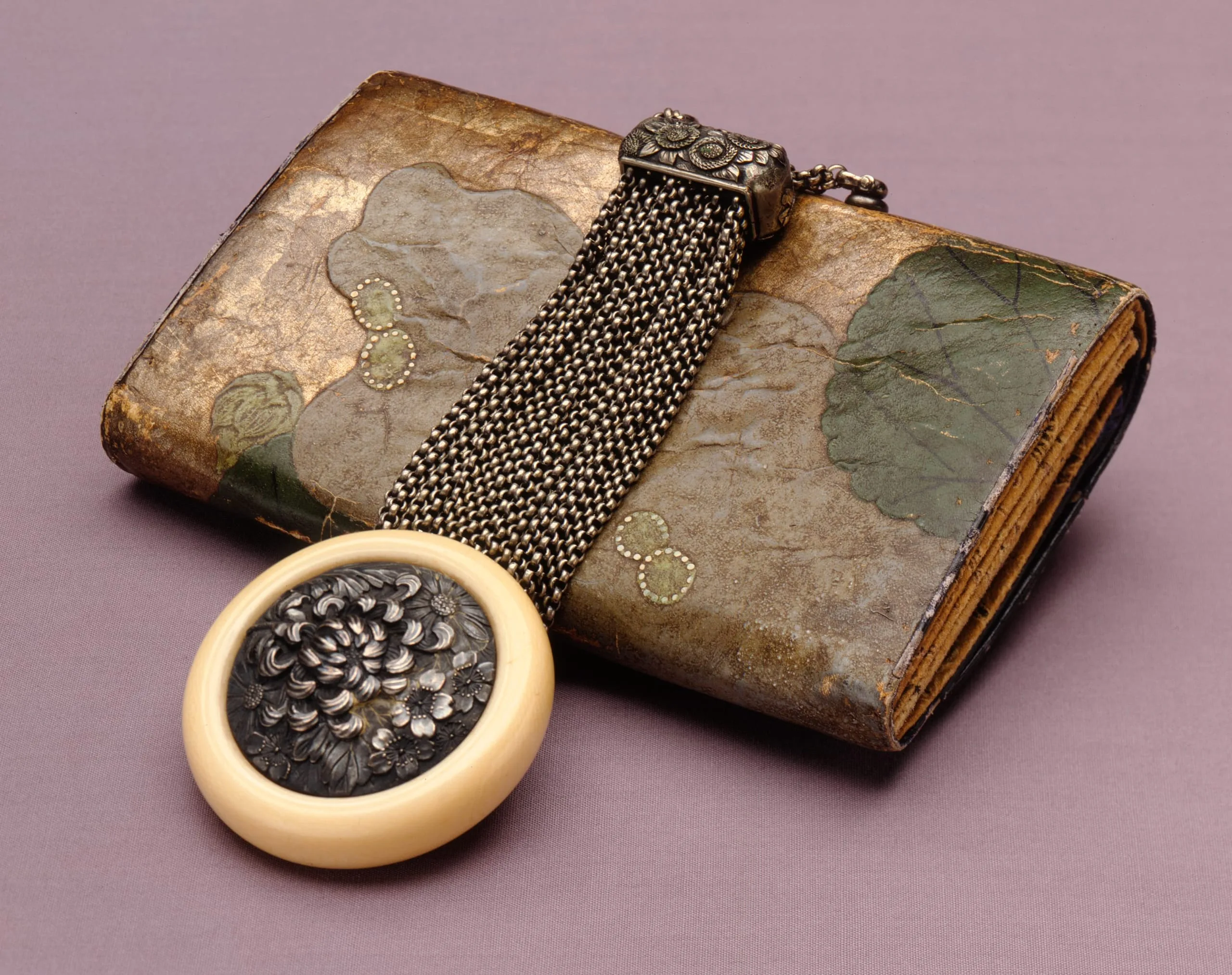 - Leather tobacco pouch with lotus design; Clasp: silver with chrysanthemum design; Kagamibuta netsuke: ivory bowl with silver disk, floral design. Interior: split leather with stamped design, silver chain