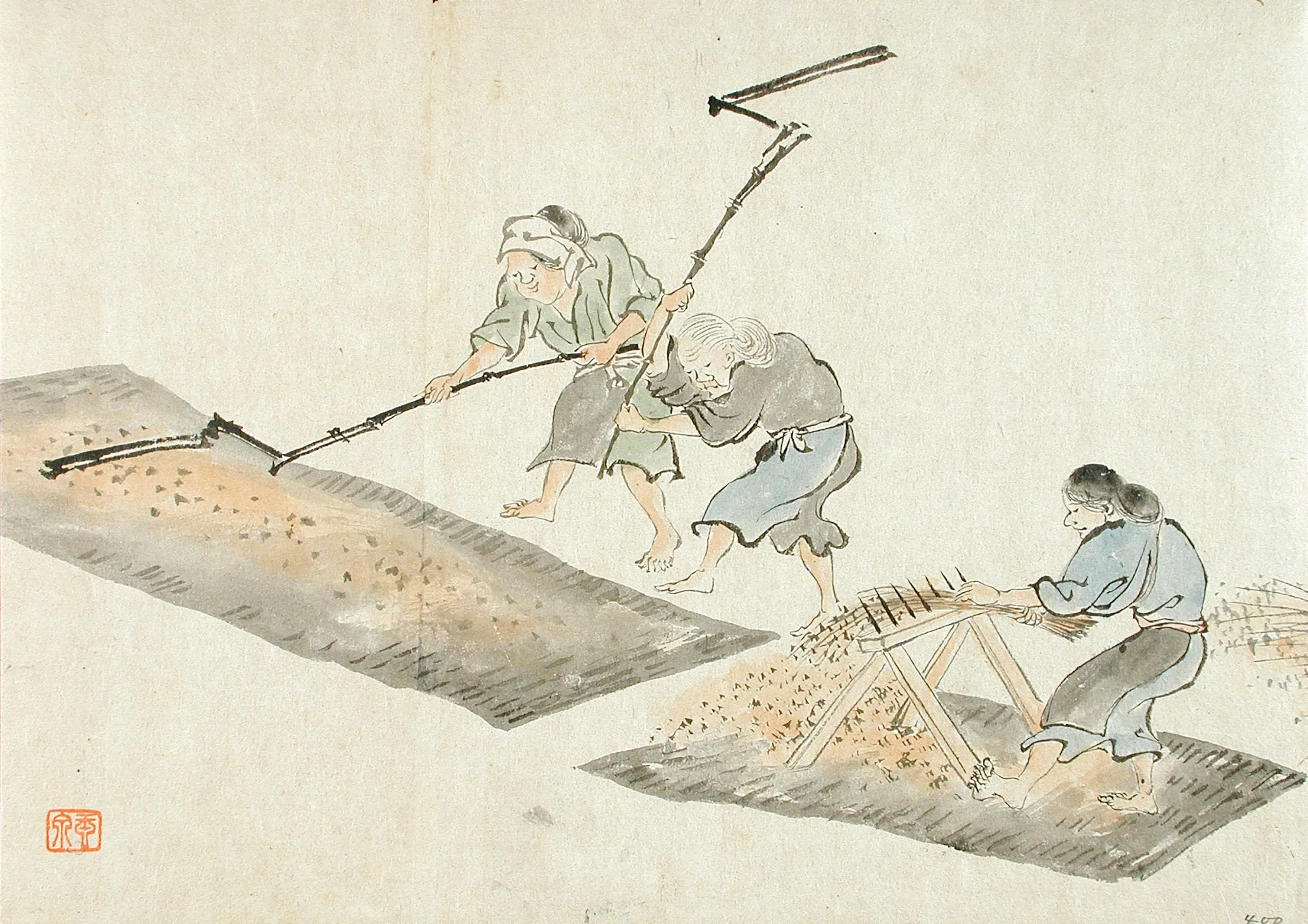Japanese ink and wash drawing of three barefoot figures threshing or winnowing grain, rendered in loose brushwork with gray-blue and green washes on cream paper