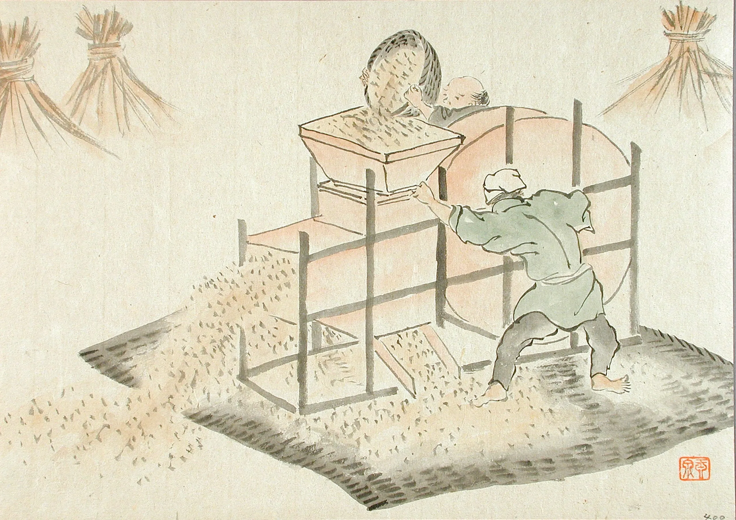 Japanese ink and wash illustration of two figures processing grain with a wooden threshing machine; one figure pours a bundle from above while another operates the device below, with grain cascading into a pile on the ground and bundled sheaves at upper corners; red seal at lower right.