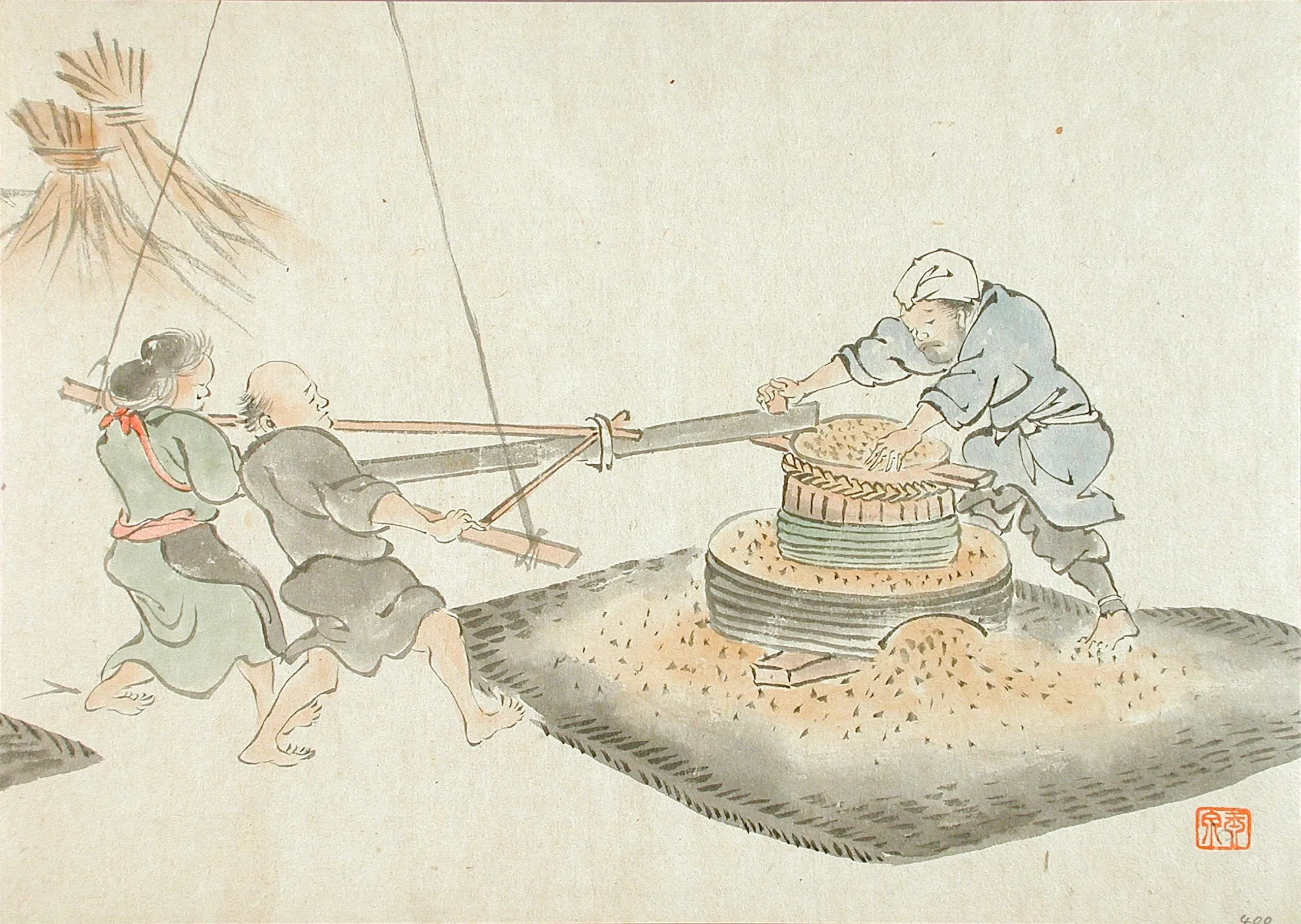 Japanese woodblock print or watercolor depicting three figures operating a large cylindrical grain mill; two figures pull a long wooden lever while a third guides material into the mill, rendered in muted blue, green, and gray washes with fluid brushwork; red seal at lower right.