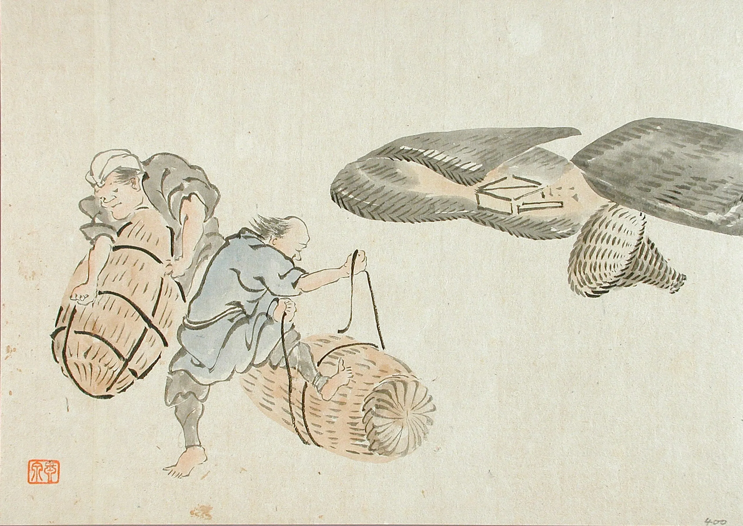 Ink and light wash painting on paper depicting two figures carrying large woven baskets, rendered with loose brushwork. A third figure at upper right, shown only from the waist down, wears a dark layered robe and carries a smaller basket. Red seal in lower left corner.