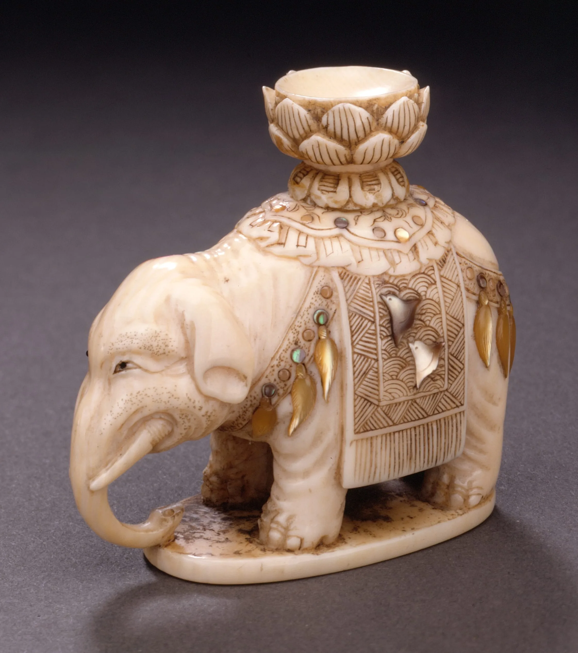 - Ivory with light staining, sumi, and inlays including mother-of-pearl