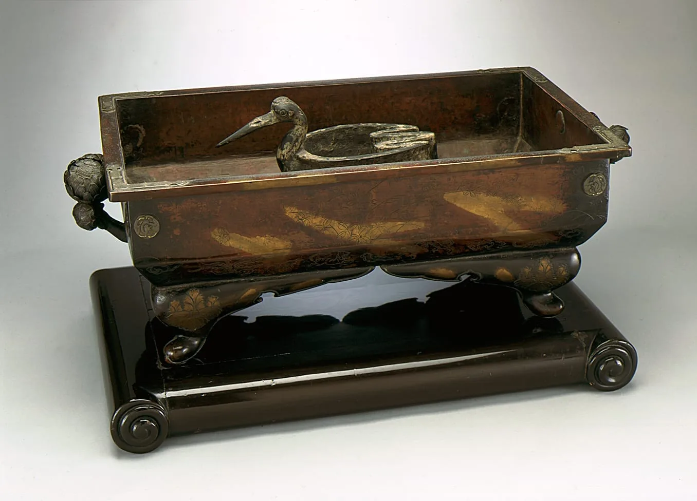 - Container: Shakudō body (copper and gold alloy), bronze handles; Crane flower holder: Lead; Base: Lacquered wood