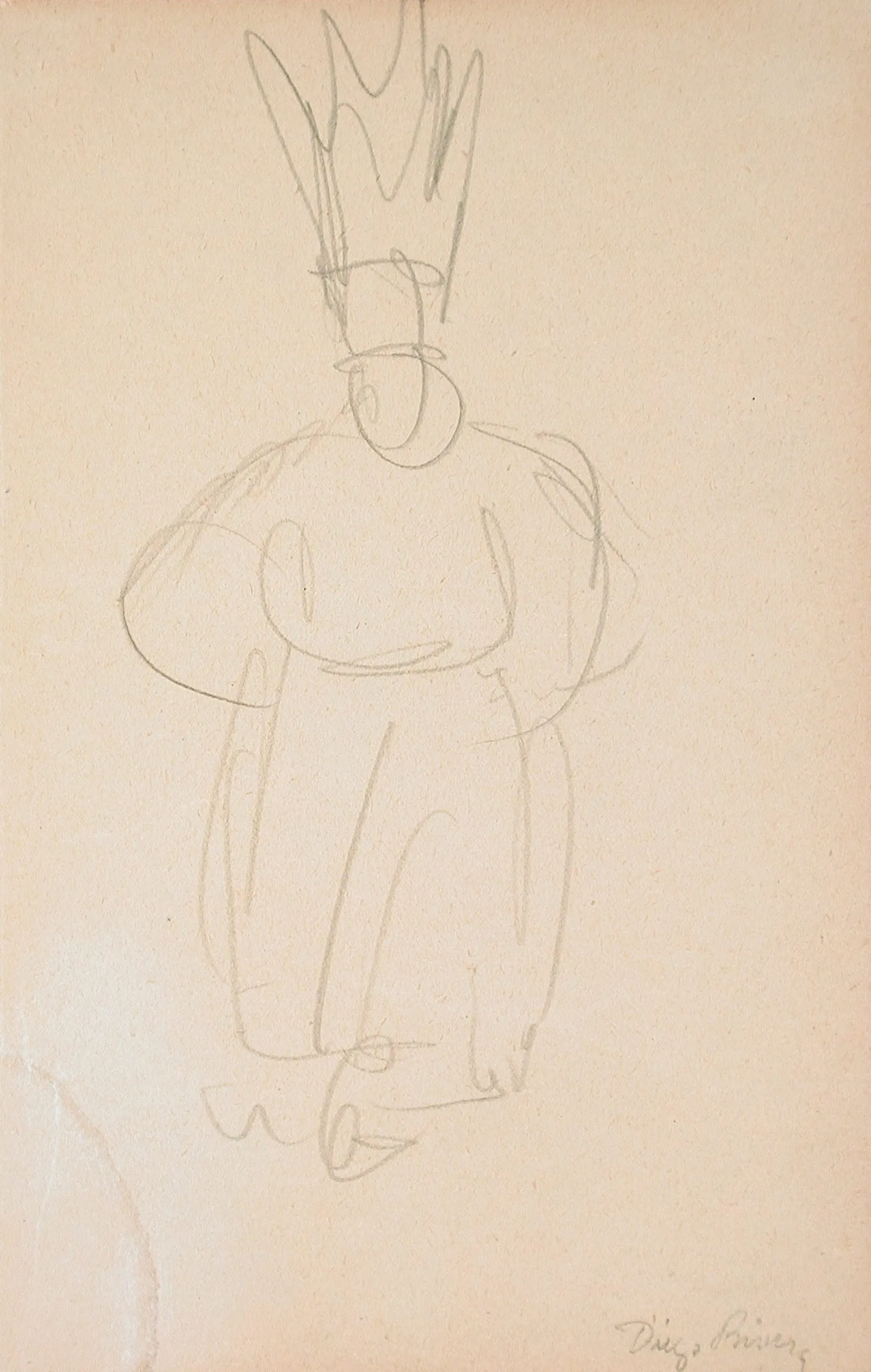 Loose graphite sketch on pale peach paper of a stout crowned figure, drawn with gestural, minimally detailed lines