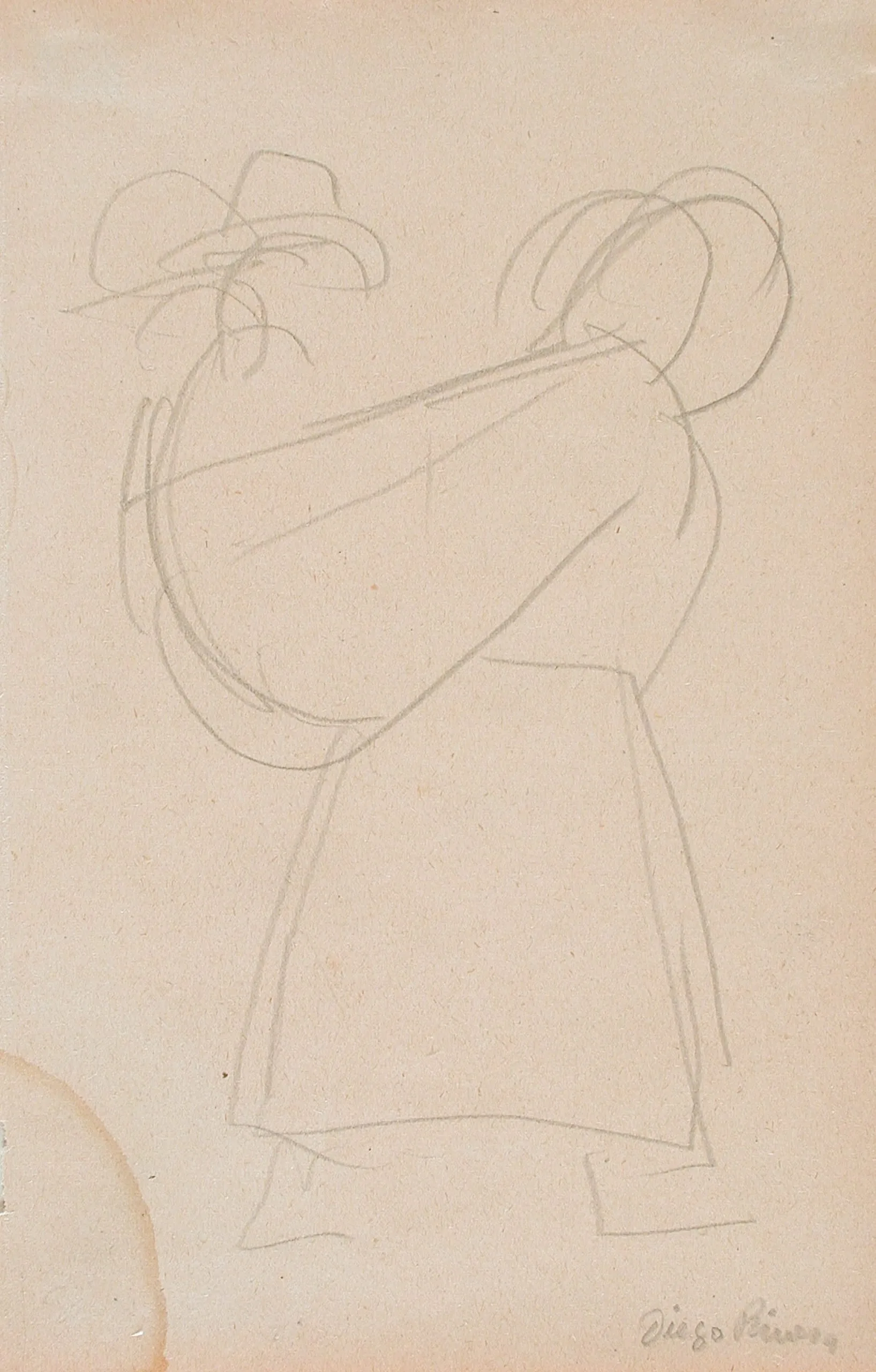 Pencil drawing on tan paper, loose gestural sketch of a cloaked standing figure with a wide-brimmed hat, signed in cursive at lower right