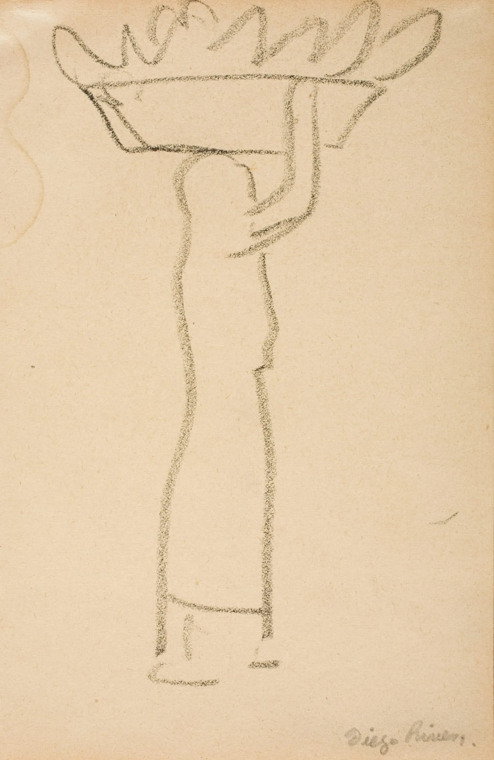 Charcoal or graphite drawing on cream paper, a simplified standing figure with arms raised, balancing a wide, irregular object overhead, signed "Diego Rivera"