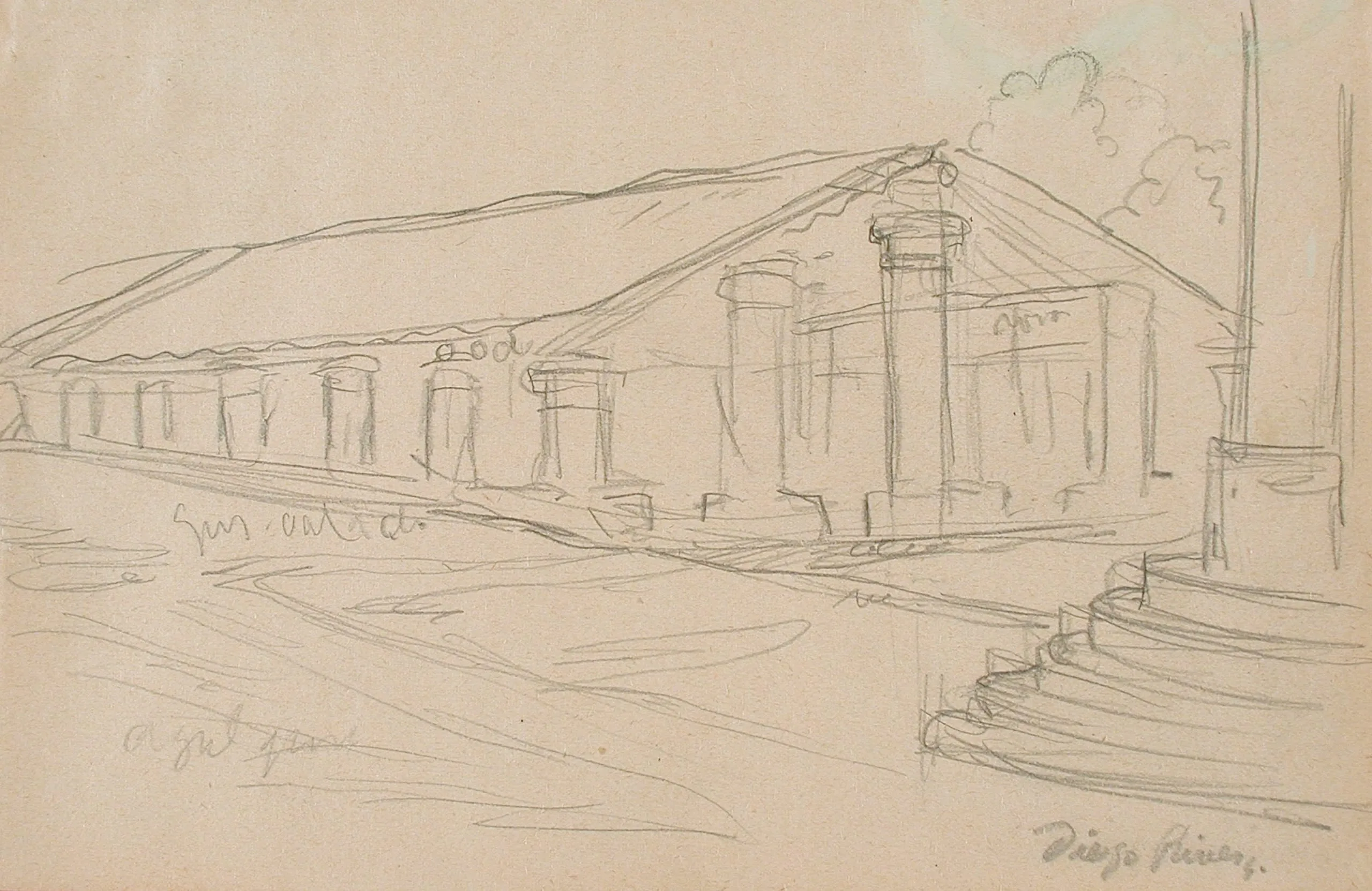 Graphite pencil sketch on tan paper of a long, low building with cylindrical columns along its facade, with handwritten annotations and a cursive signature reading Diego Rivera