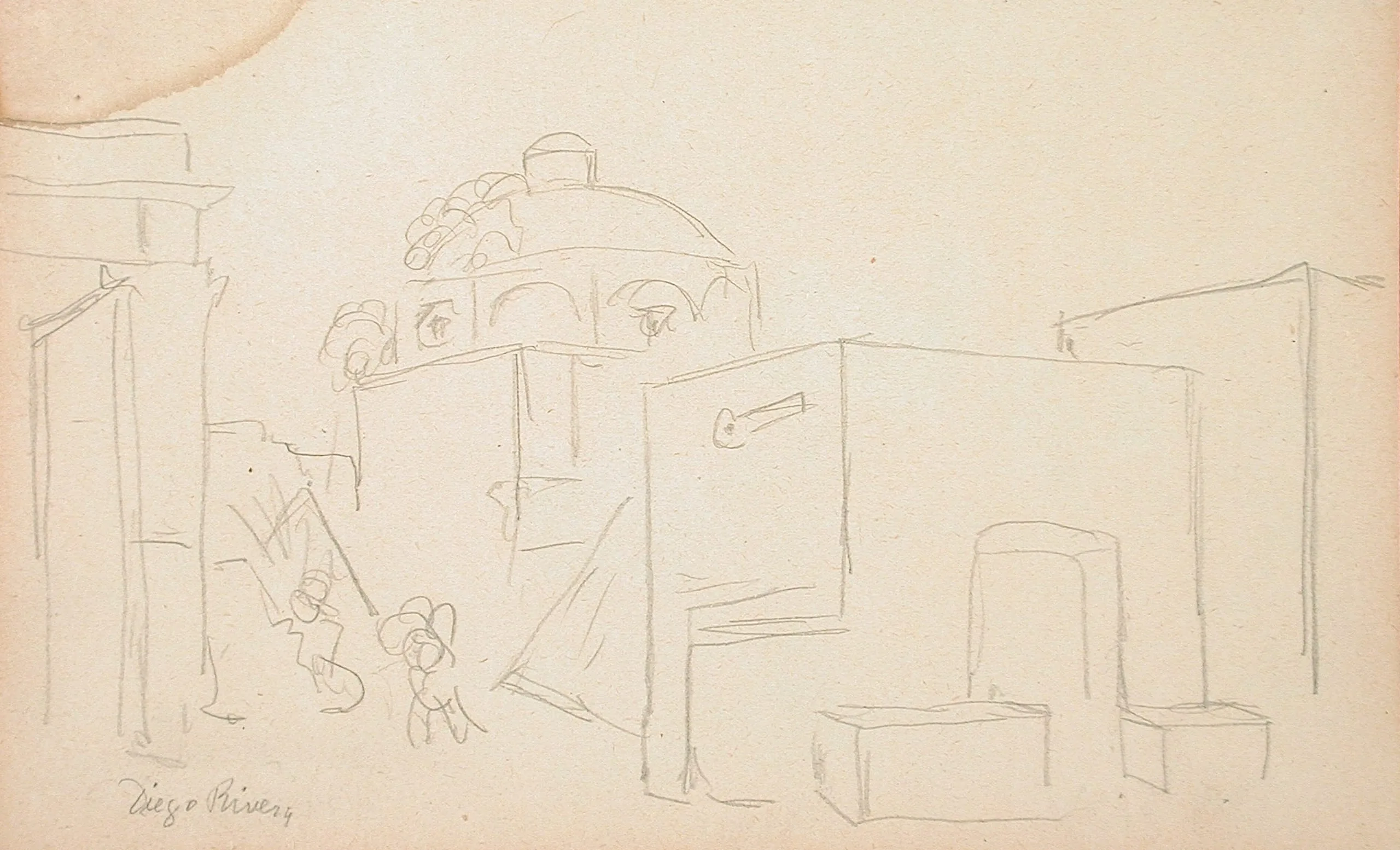 Pencil sketch on cream paper of an architectural scene with a central domed building, flanking blocky structures, and two small loosely drawn figures at lower left, signed in cursive