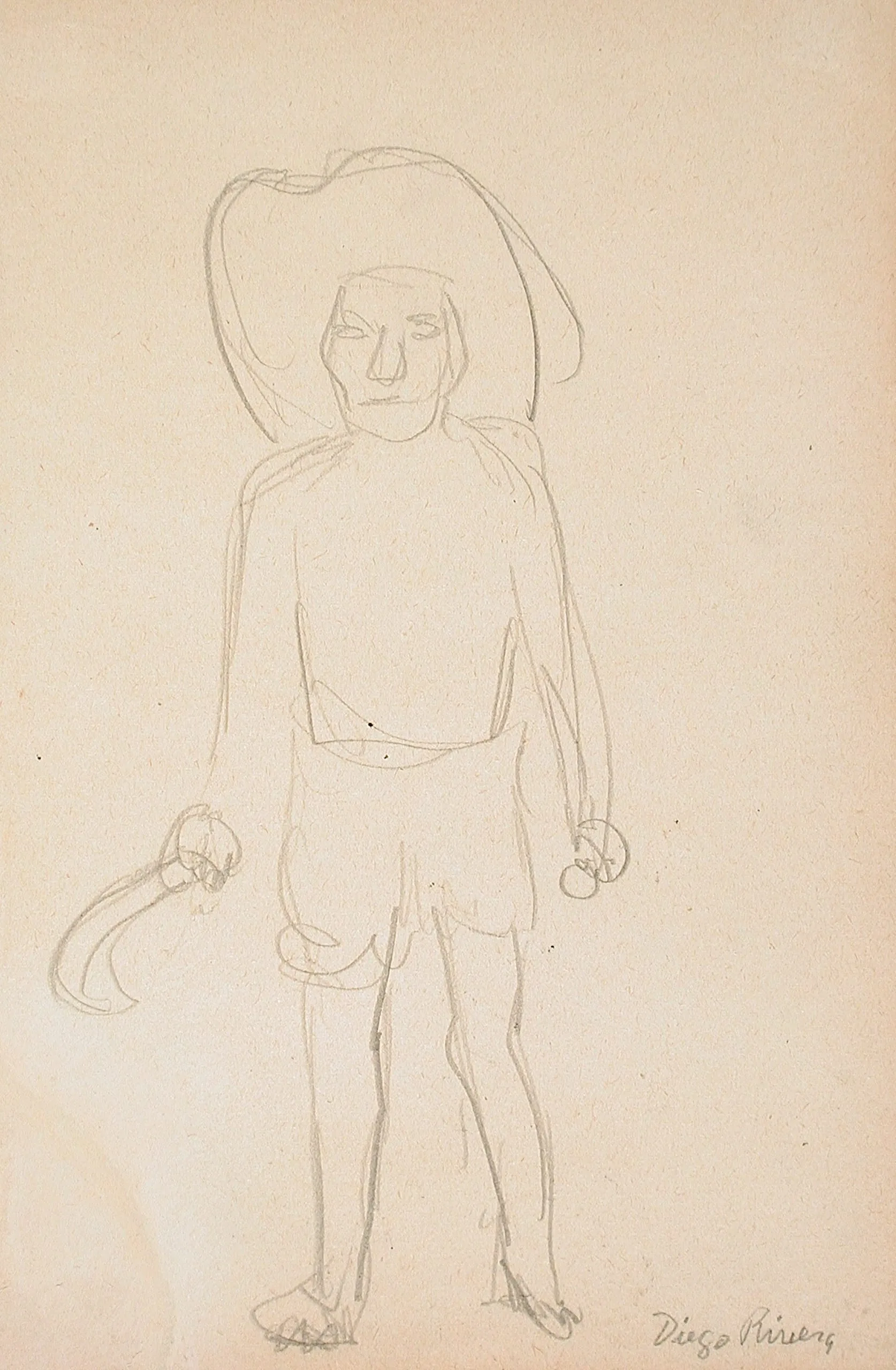 Loose graphite pencil drawing on tan paper of a standing figure in a wide-brimmed floppy hat, holding round objects in each hand, signed 'Diego Rivera' in ink at lower right