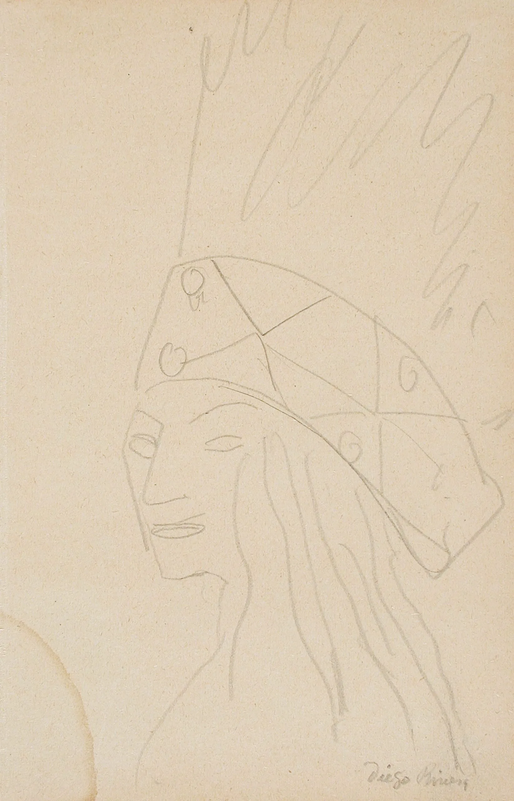 Loose graphite drawing on cream paper of a figure in a geometric headdress with radiating feather-like strokes, signed 'Diego Rivera' lower right