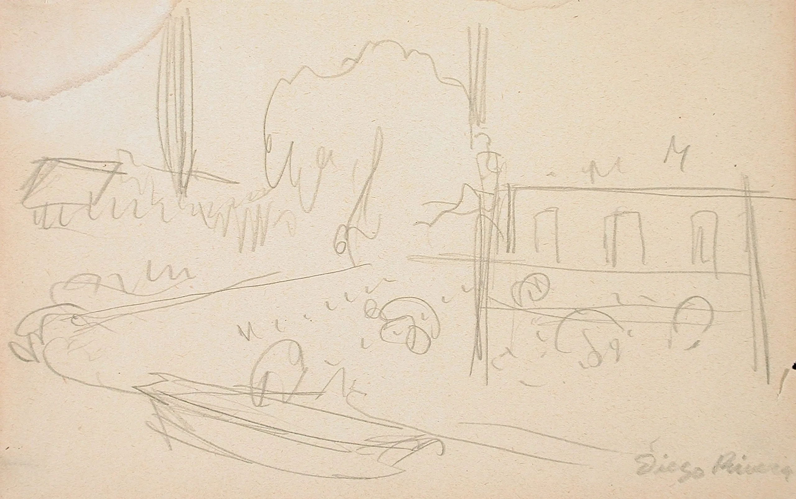 Gestural graphite landscape drawing on cream paper, with loose lines suggesting trees, buildings, a boat, and a receding path; signed 'Diego Rivera' lower right