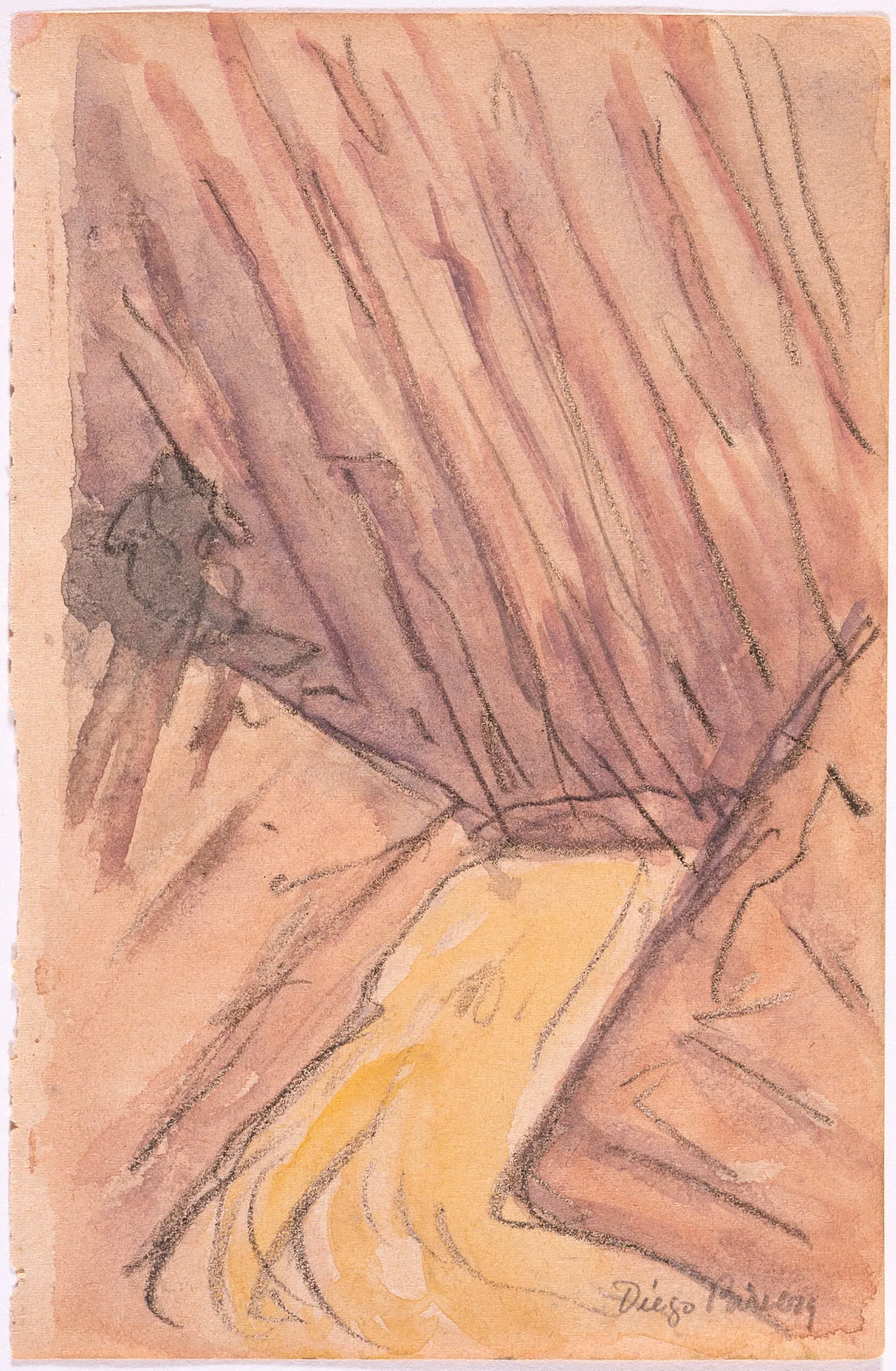 Watercolor and charcoal drawing on salmon-pink paper, diagonal purple and mauve strokes suggest rock walls or tree trunks flanking a winding golden-yellow path