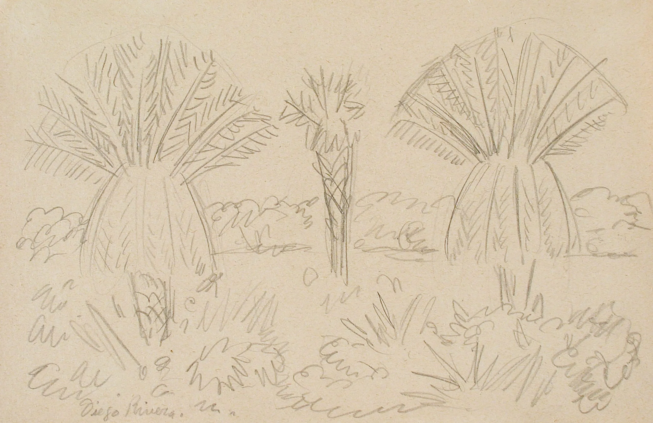 Graphite pencil sketch on tan paper of three large fan-leafed trees with loose, gestural strokes and low shrubs below; signed in cursive at lower left