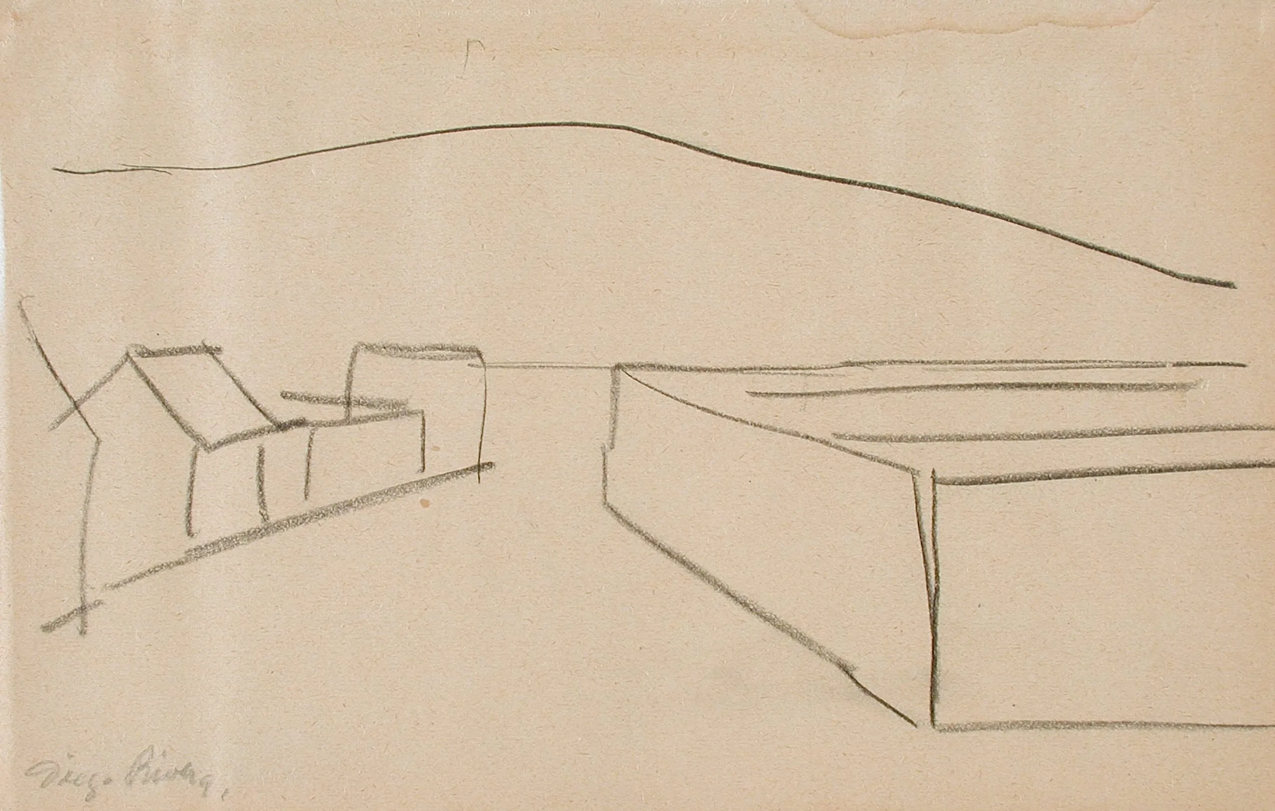 Gestural graphite drawing on tan paper, sparse landscape with angular building outlines and a long curved hill silhouette, signed in cursive lower left