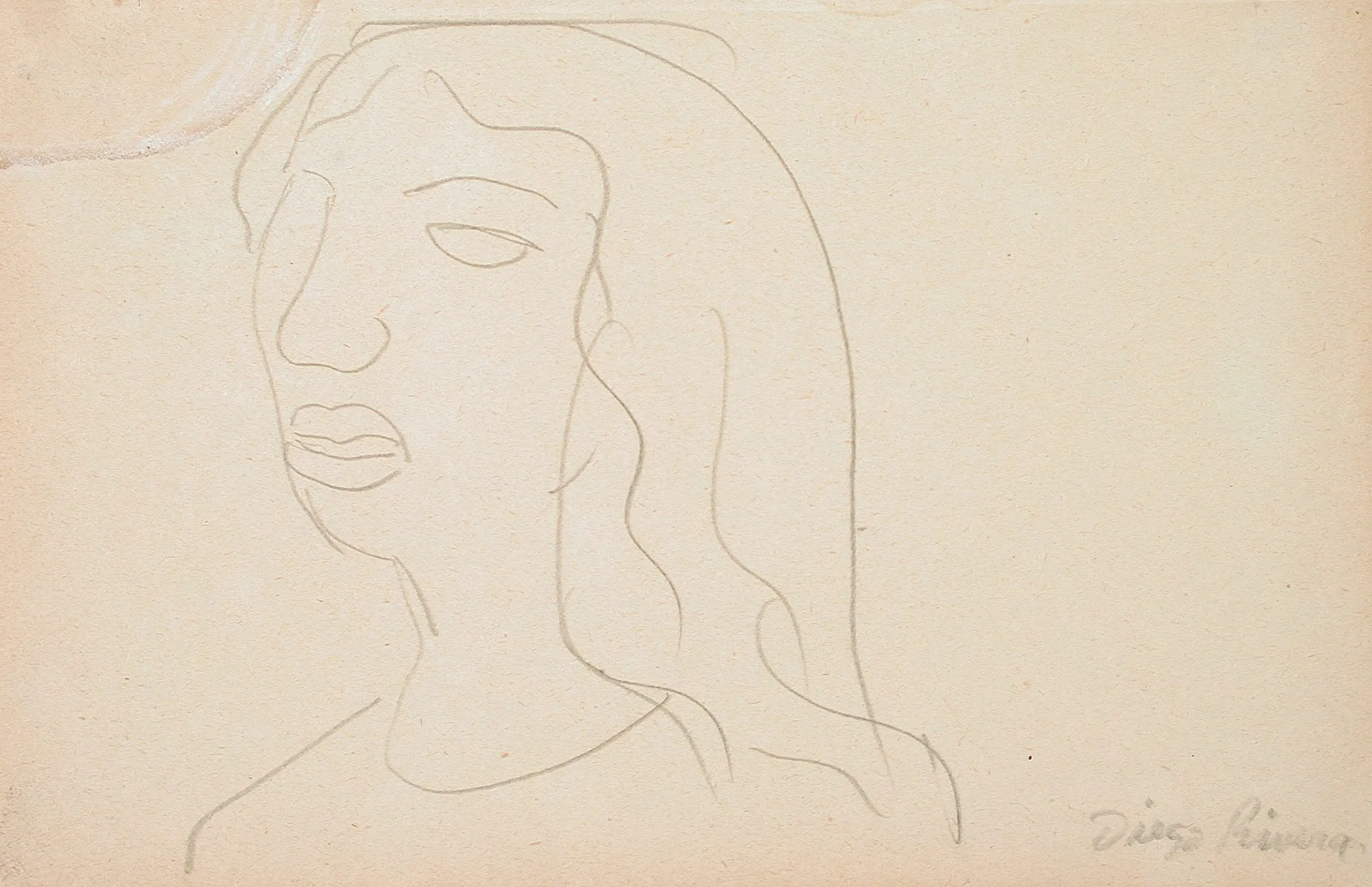 Minimalist graphite line drawing of a head and shoulders on cream paper, figure facing left with loosely drawn long wavy hair, signed in cursive lower right