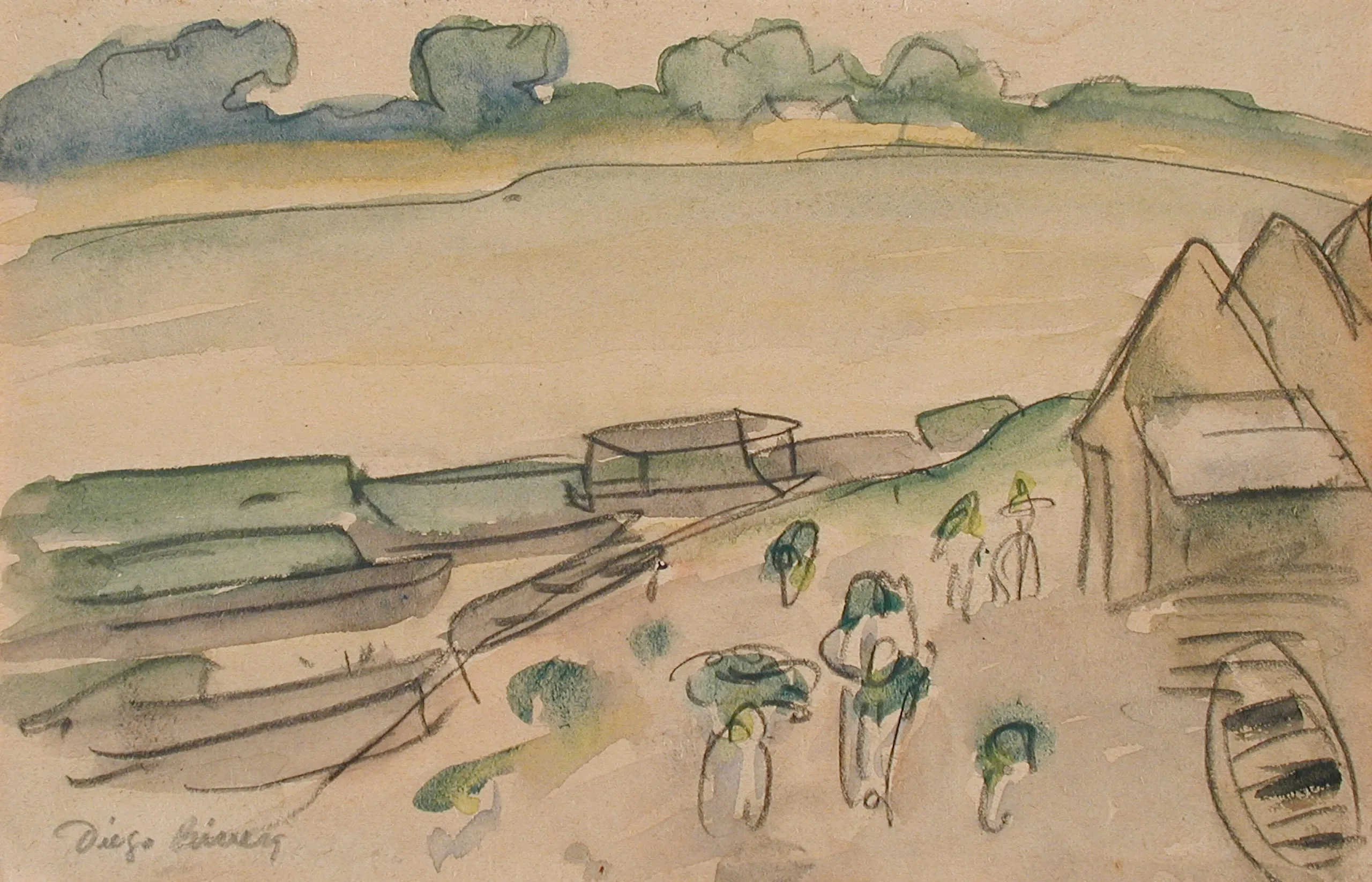 Pencil and watercolor drawing of a waterside scene with boats, loosely rendered figures in wide-brimmed hats, and low buildings on a sandy shore