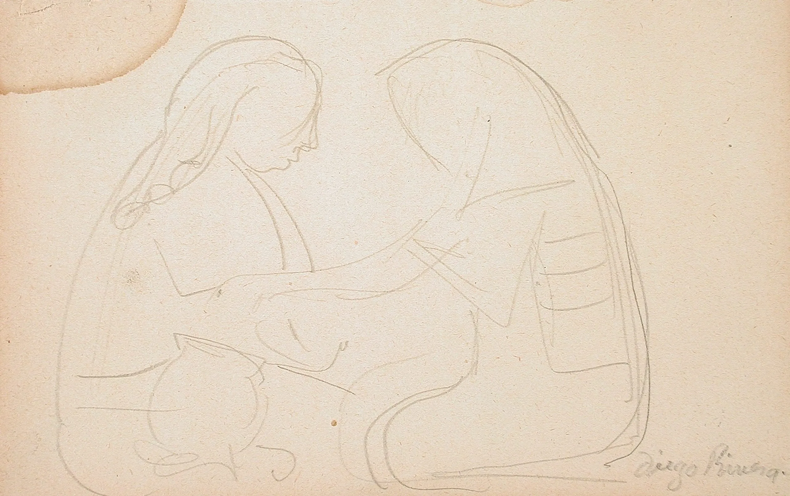 Faint pencil drawing on aged cream paper, two seated figures in profile facing each other, rendered with minimal loose lines