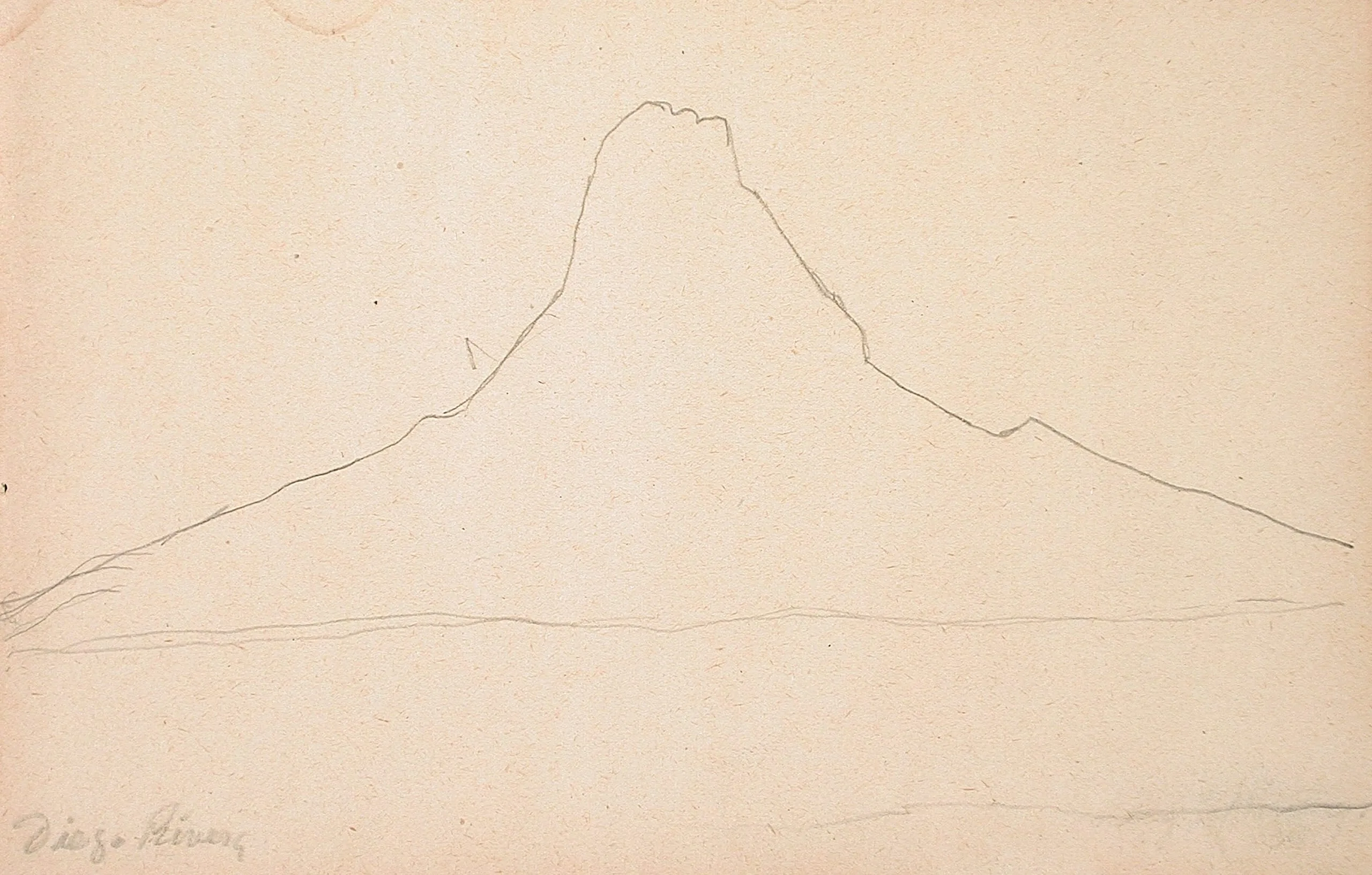 Graphite sketch on pale pink paper of a single mountain or mesa in outline, with minimal detail and a handwritten inscription in the lower left corner