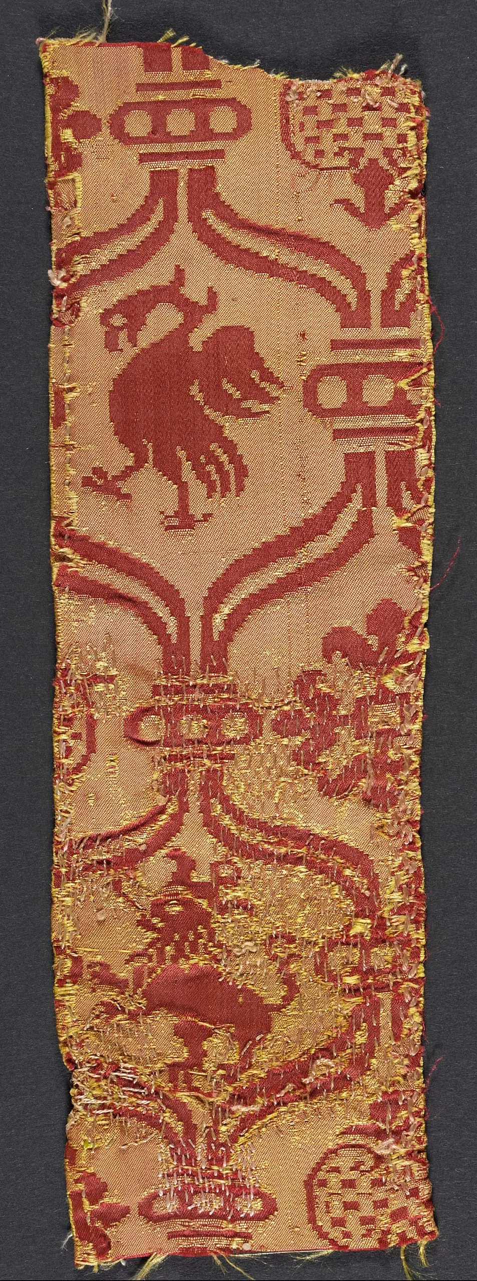Narrow vertical silk textile fragment woven in crimson and gold, with ogival medallions enclosing a bird and dragon motif and Chinese-style character emblems