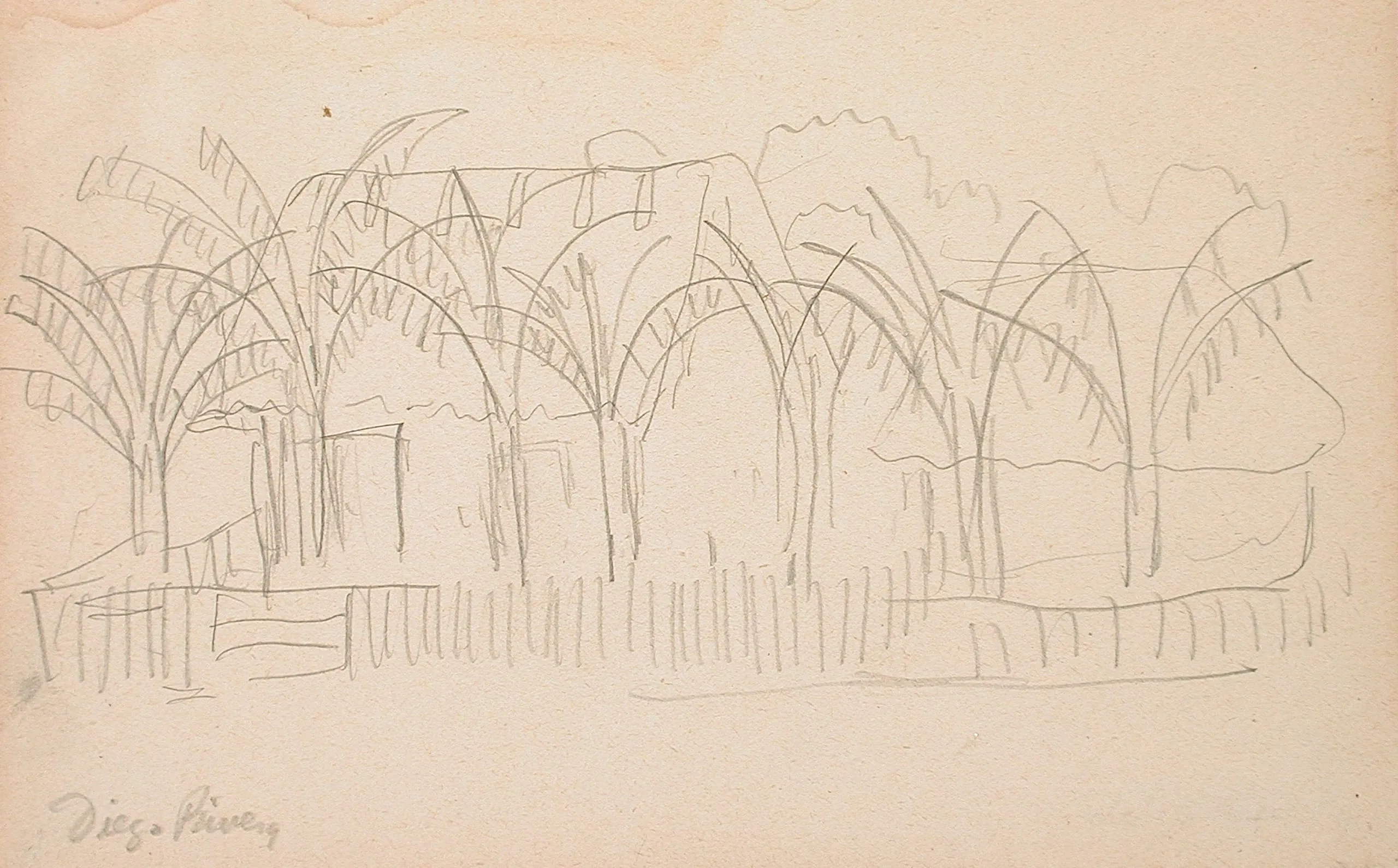 Pencil drawing on cream paper of a row of tall tropical plants with arching fronds, gestural lines, signed in cursive at lower left