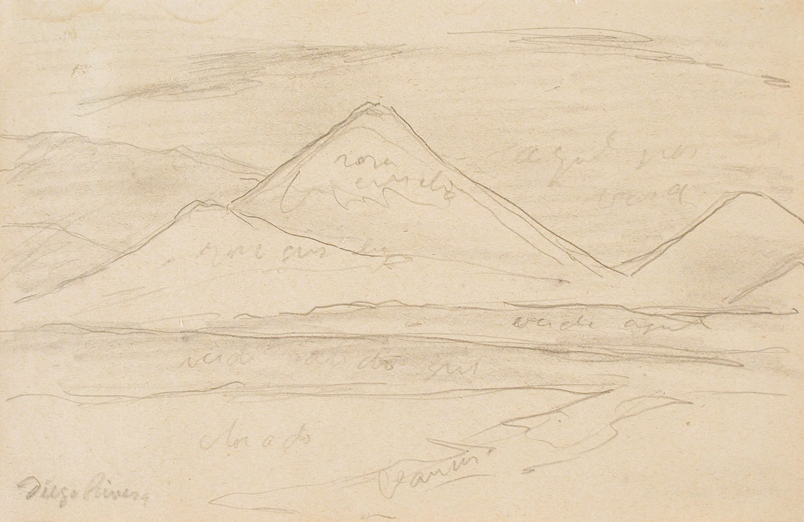 Pencil drawing on tan paper of a volcanic mountain landscape with gestural lines and handwritten Spanish annotations throughout, signed 'Diego Rivera' at lower left