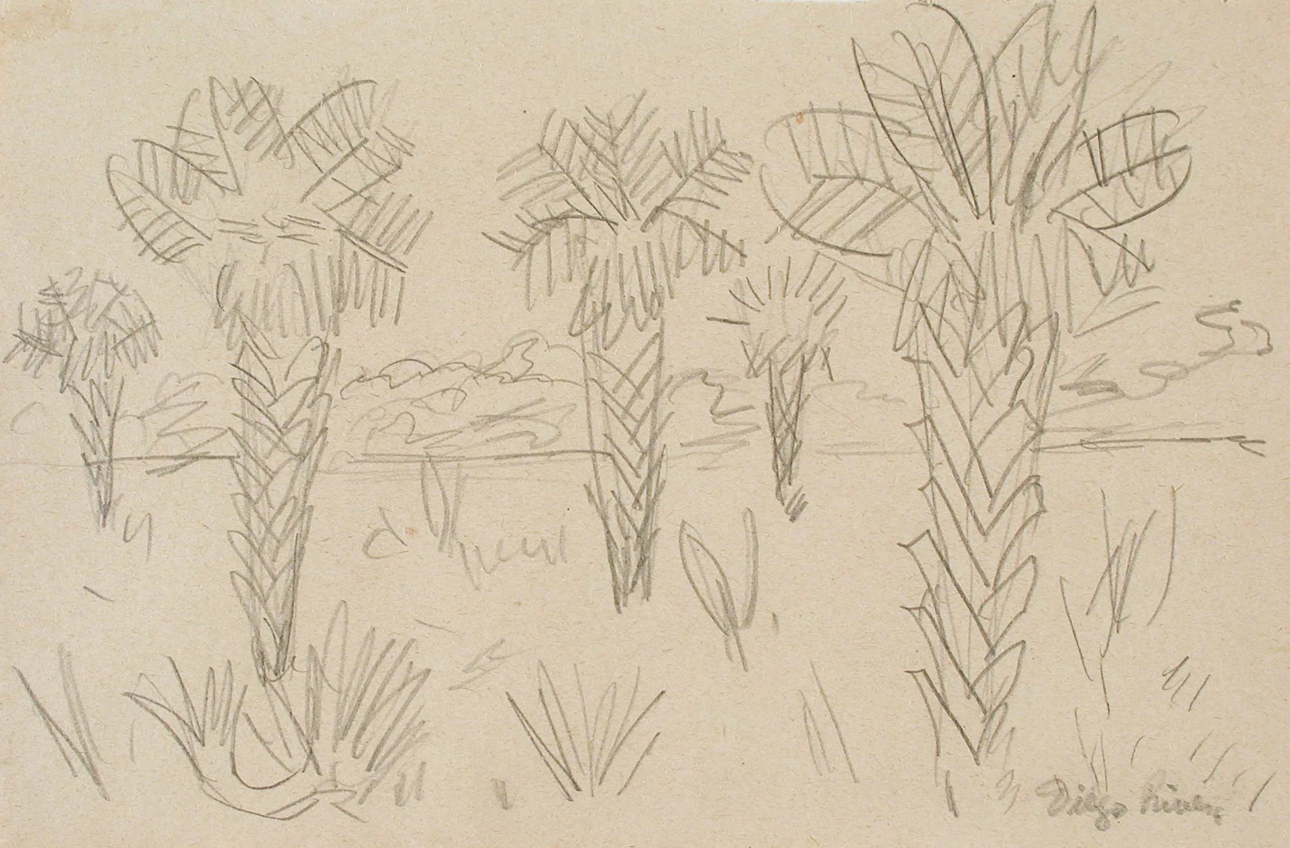 Graphite drawing on tan paper of four palm trees in a loose, sketchy style, with low vegetation and a distant horizon; signed 'Diego Rivera' lower right