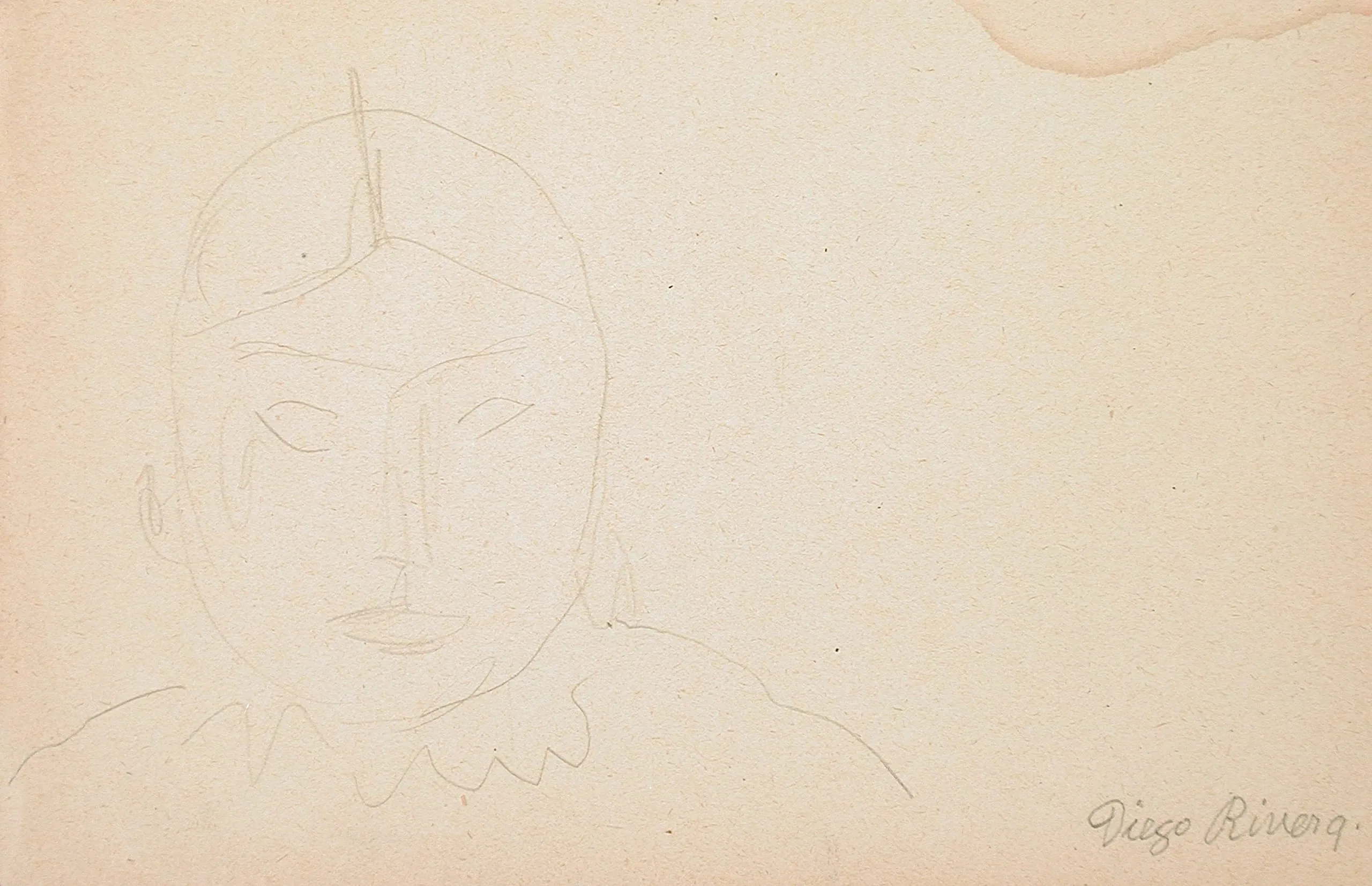 Loose graphite sketch on cream paper, head and shoulders of a figure with short hair and a scalloped collar, signed in cursive lower right