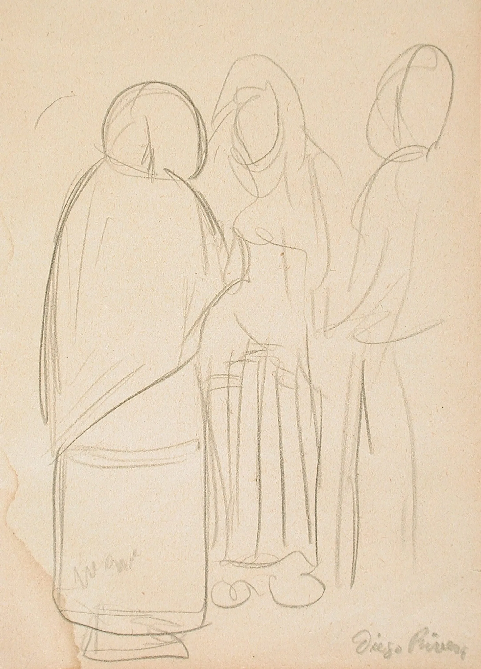 Graphite drawing on cream paper, three loosely sketched hooded figures in long robes, signed in cursive at lower right