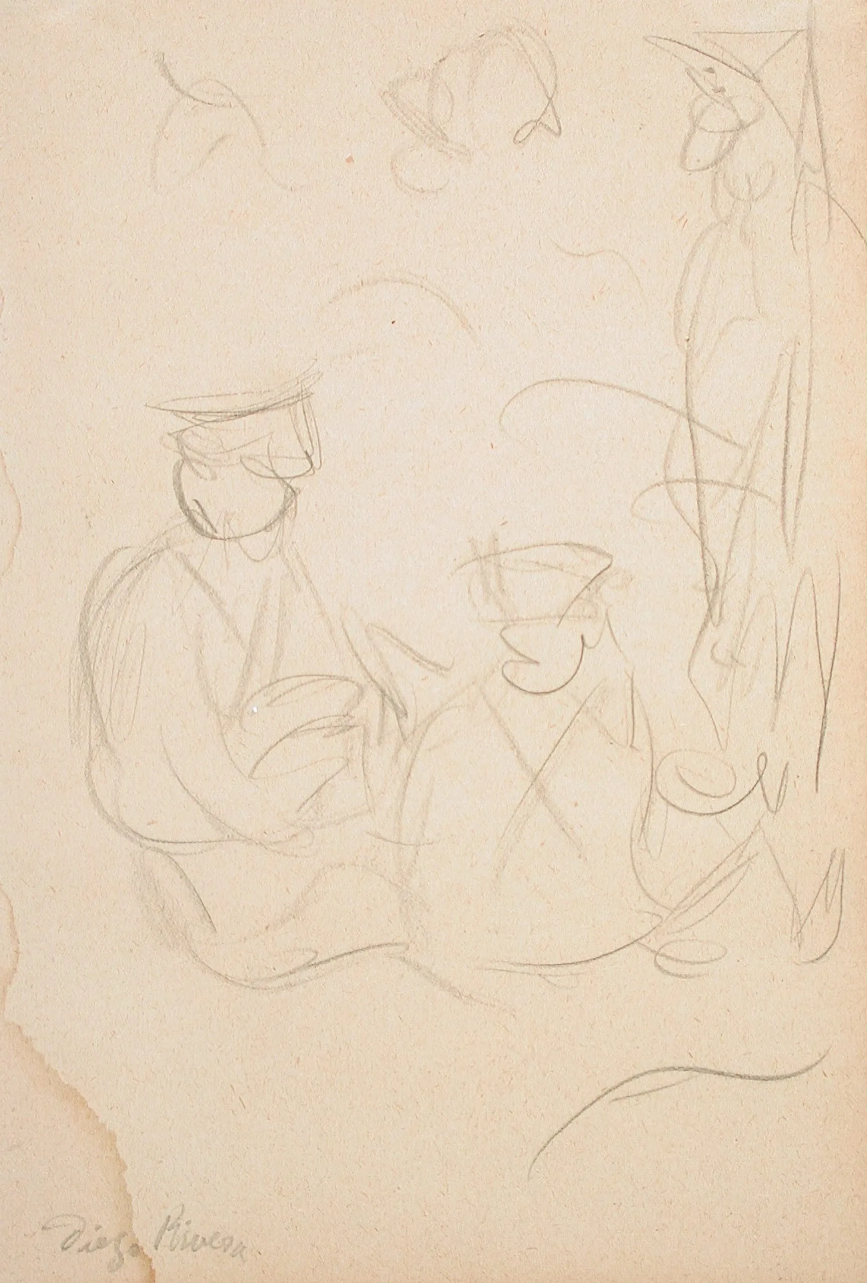 Pencil sketch on cream paper, two loosely drawn seated figures with gestural lines and faint figure studies in the upper portion, signed in cursive at lower left