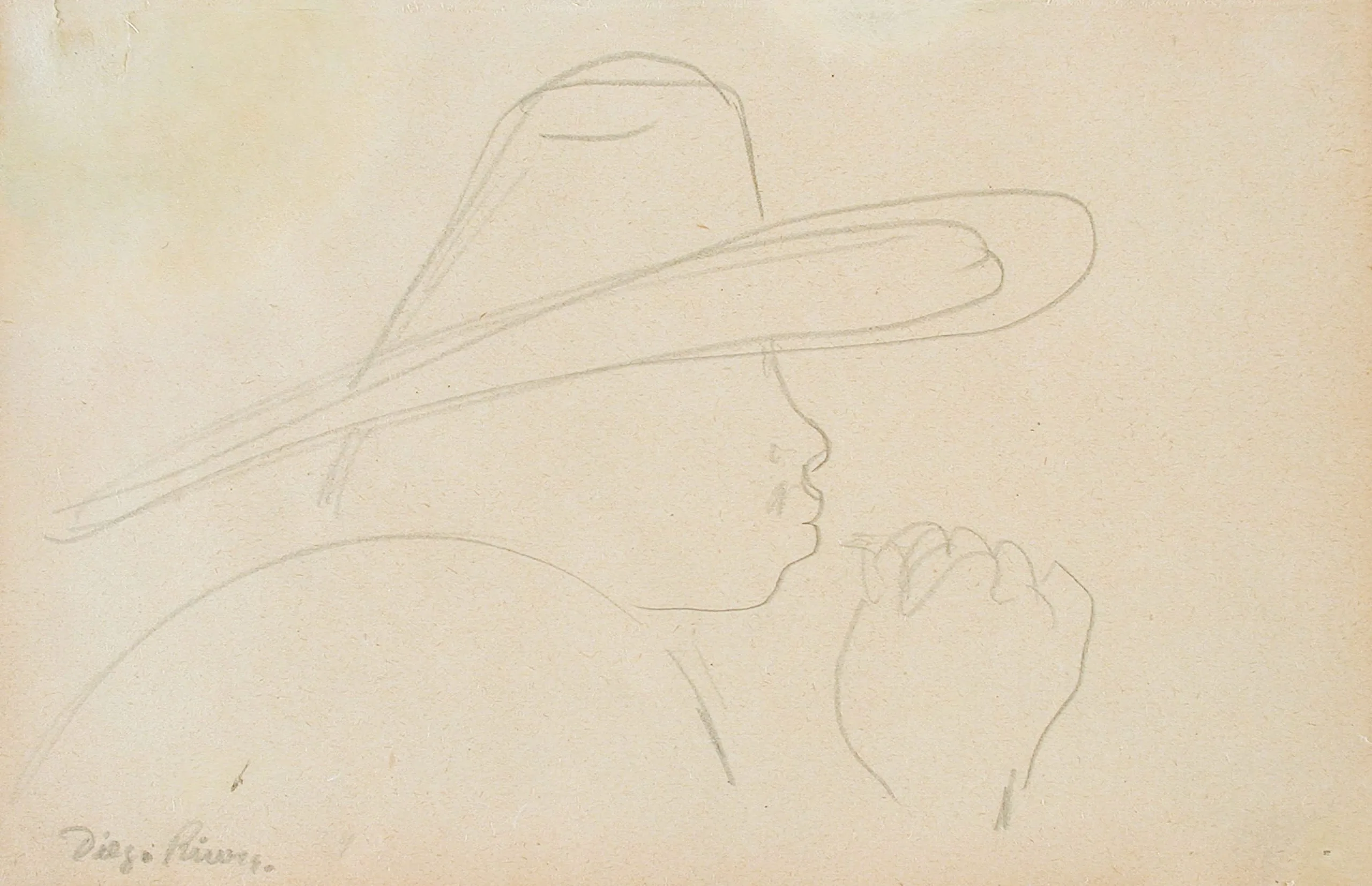 Graphite pencil drawing on cream paper, profile view of a figure in a wide-brimmed hat with a raised hand near the chin, minimal contour lines