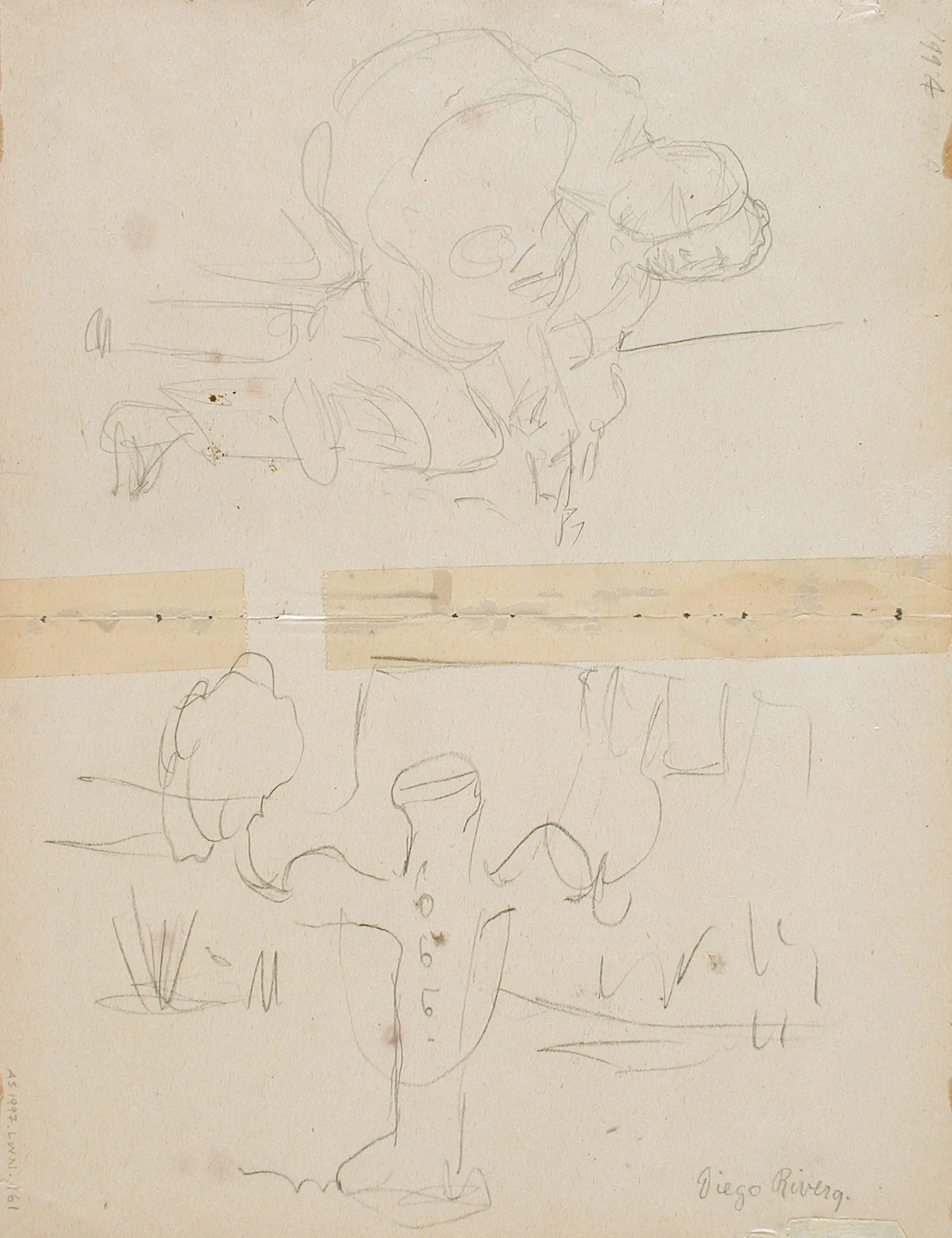 Graphite drawing on cream paper with two sketch studies separated by a band of aged tape; loose figure studies with a signature reading 'Diego Rivera' at lower right