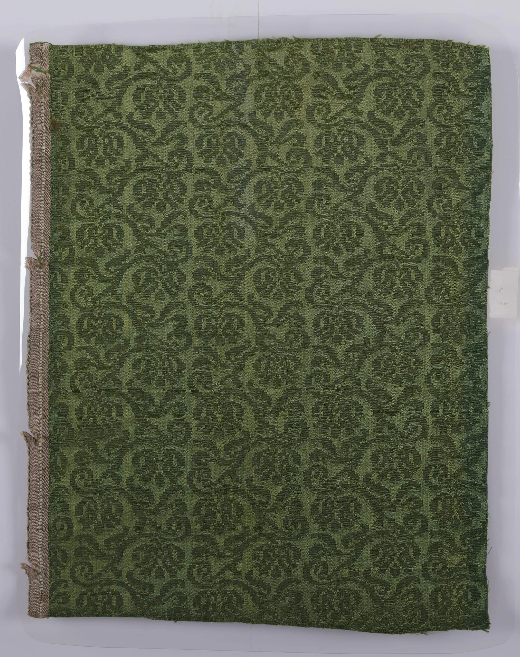 Textile sample with allover woven foliate pattern in dark and medium forest green, with symmetrical scroll and palmette motifs on a damask-like ground, finished selvedge at left