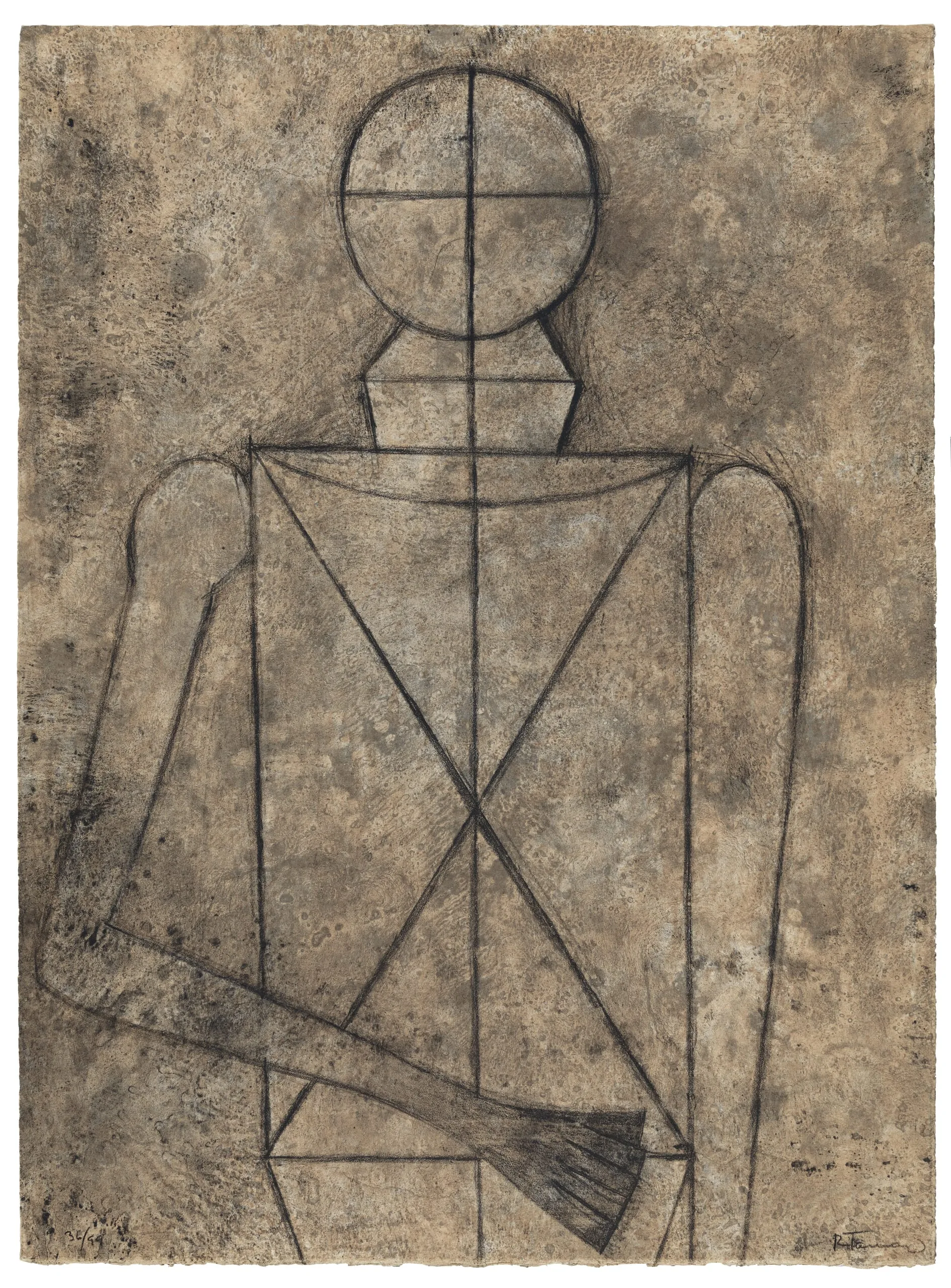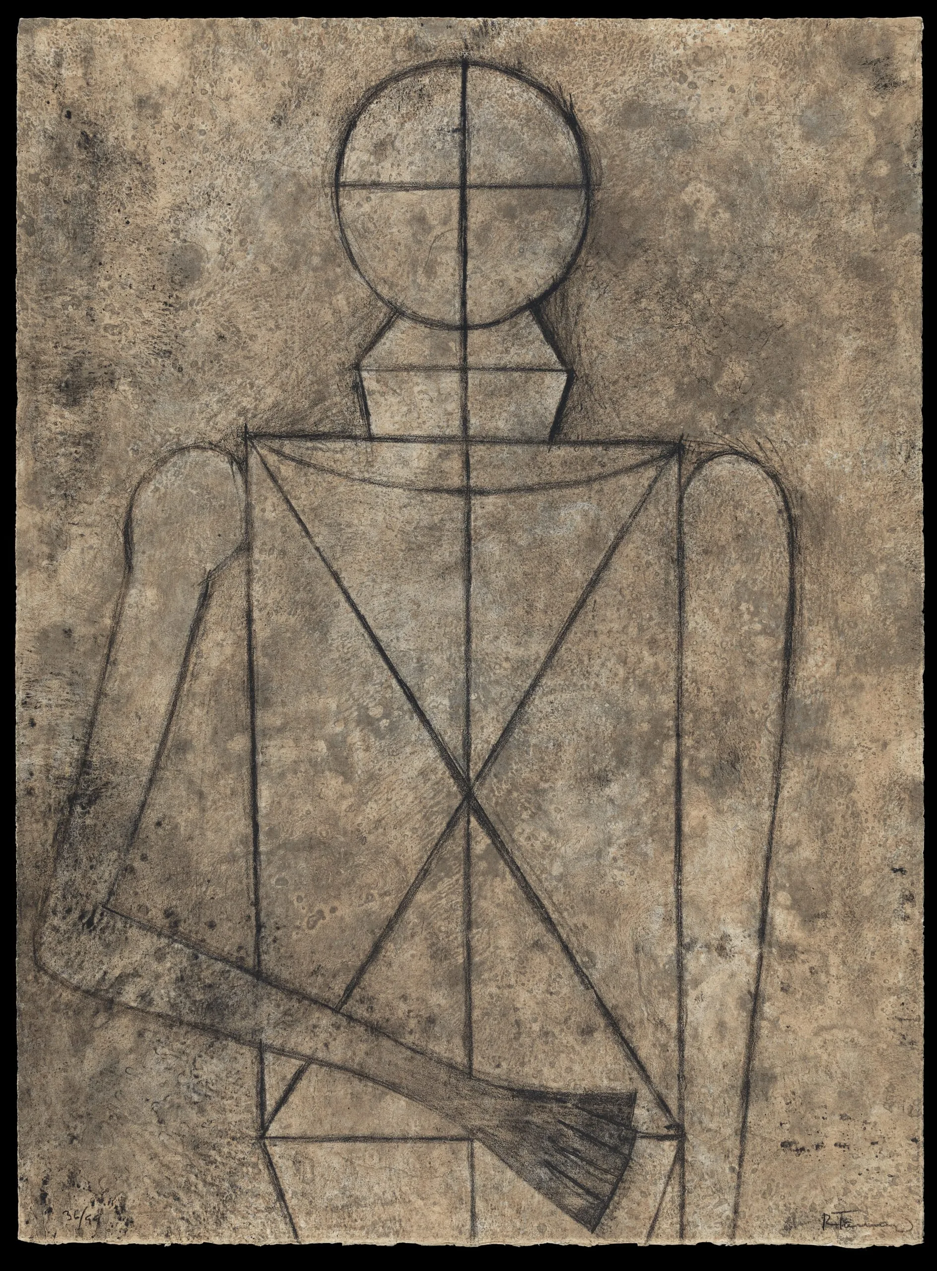 While identified as an etching, this work by Rufino Tamayo in fact combines a mixture of printmaking techniques and varied textures, which is consistent with other prints the artist made at the Polígrafa print studio in Barcelona. Here, Tamayo reduces the figure to a series of basic shapes that indicate the human body: a circle for a head, a hexagon for a neck, and a large rectangle inscribed with an “X” for the torso. A line runs from the tip of the head to the base of the image, emphasizing the figure’s verticality. A horizontal line suggests eye placement and an upturned arc evokes a collarbone. However, the figure lacks any distinguishing features or details, with the exception of the outlines of fingers and shading to emphasize the hand—the artist’s tool.