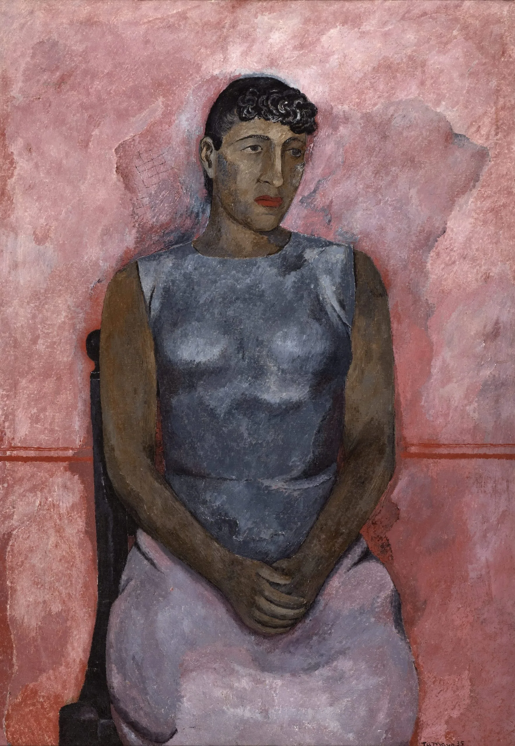 While painting his mural Song and Music (El canto y la música) at Mexico’s National School of Music in 1933, Rufino Tamayo met Olga Flores Rivas, a piano student at the school. The two soon married and in 1935, Tamayo created this portrait in honor of their first anniversary, joining a long tradition of artists who painted their lovers. Elegantly portrayed, Olga sits tall and steady, with her hands gently clasped in her lap. Here, Tamayo references a broad painting tradition while also providing a sense of his sitter’s individual character. Olga was a frequent subject and model for her husband, a striking fact considering that Tamayo created few portraits—excluding those of his wife. While on one hand this series of portraits may reflect the couple’s devotion to one another, these visual references also suggest that Tamayo was self-consciously thinking about his place in a larger art historical narrative.